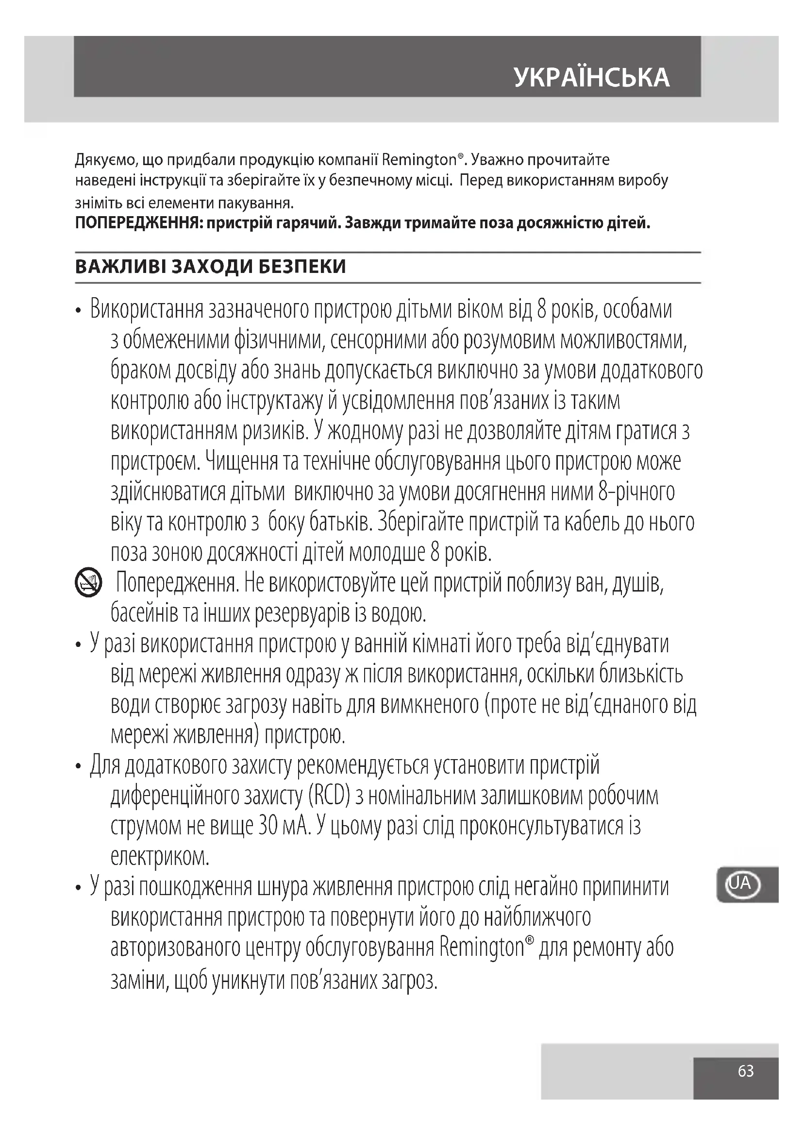 Дякуємо, що придбали продукцію компанії Remington®. Уважно прочитайте наведені інструкції та зберігайте їх у безпечному місці. Перед використанням виробу зніміть всі елементи пакування. ПОПЕРЕДЖЕННЯ: пристрій гарячий. Завжди тримайте поза досяжністю дітей. ВАЖЛИВІ ЗАХОДИ БЕЗПЕКИ