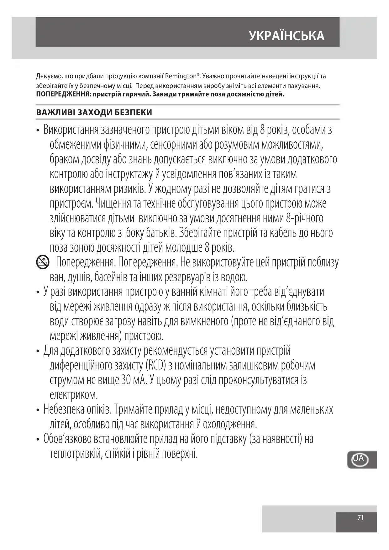 Дякуємо, що придбали продукцію компанії Remington®. Уважно прочитайте наведені інструкції та зберігайте їх у безпечному місці. Перед використанням виробу зніміть всі елементи пакування. ПОПЕРЕДЖЕННЯ: пристрій гарячий. Завжди тримайте поза досяжністю дітей. ВАЖЛИВІ ЗАХОДИ БЕЗПЕКИ