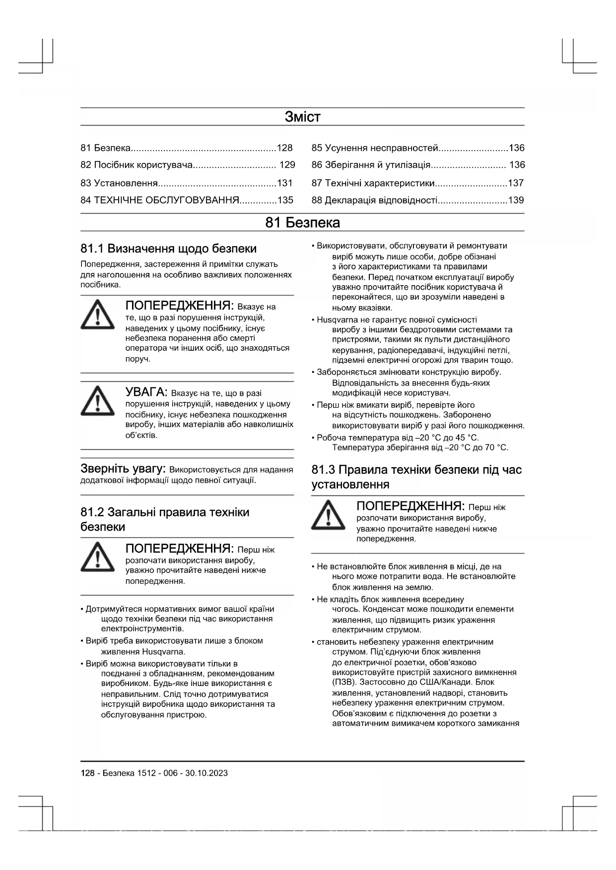 - ETSI EN 303 413 V1.2.1 Manne Alzén Huskvarna DirectorProRoboticsR&DHusqvarnaAB. Husqvarna Division. Verantwortlich für die technische Dokumentation. 1512 - 006 - 30.10.2023 Konformitätserklärung - 127Зміст 81 Безпека......................................................128 82 Посібник користувача............................... 129 83 Установлення............................................131 84 ТЕХНІЧНЕ ОБСЛУГОВУВАННЯ..............135 85 Усунення несправностей..........................136 86 Зберігання й утилізація............................ 136 87 Технічні характеристики...........................137 88 Декларація відповідності..........................139 81 Безпека