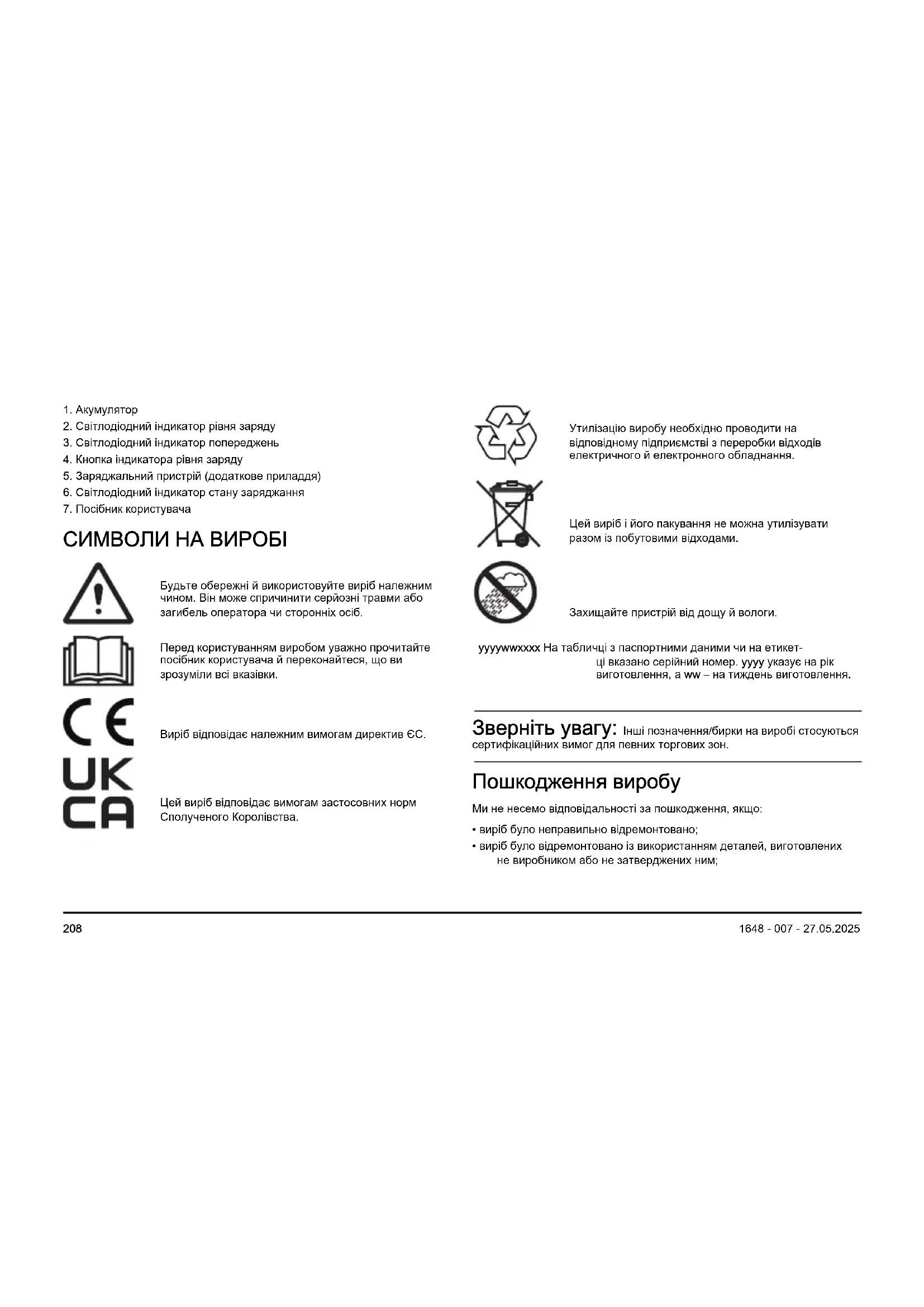 1648 - 007 - 27.05.2025• Перед довготривалим зберіганням акумулятор необхідно зарядити на 30–50%.