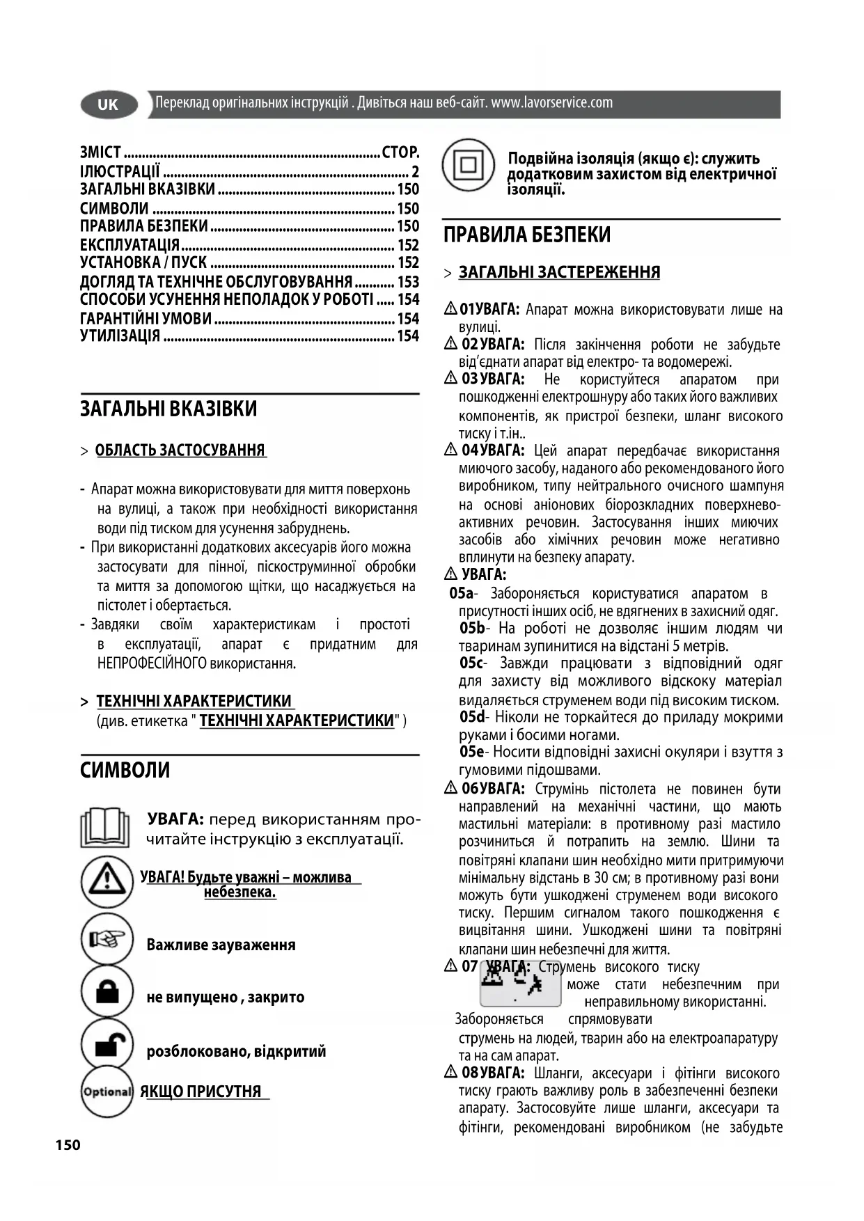 УВАГА: Струмень високого тиску може стати небезпечним при неправильному використаннi. Забороняється спрямовувати струмень на людей, тварин або на електроапаратуру та на сам апарат.