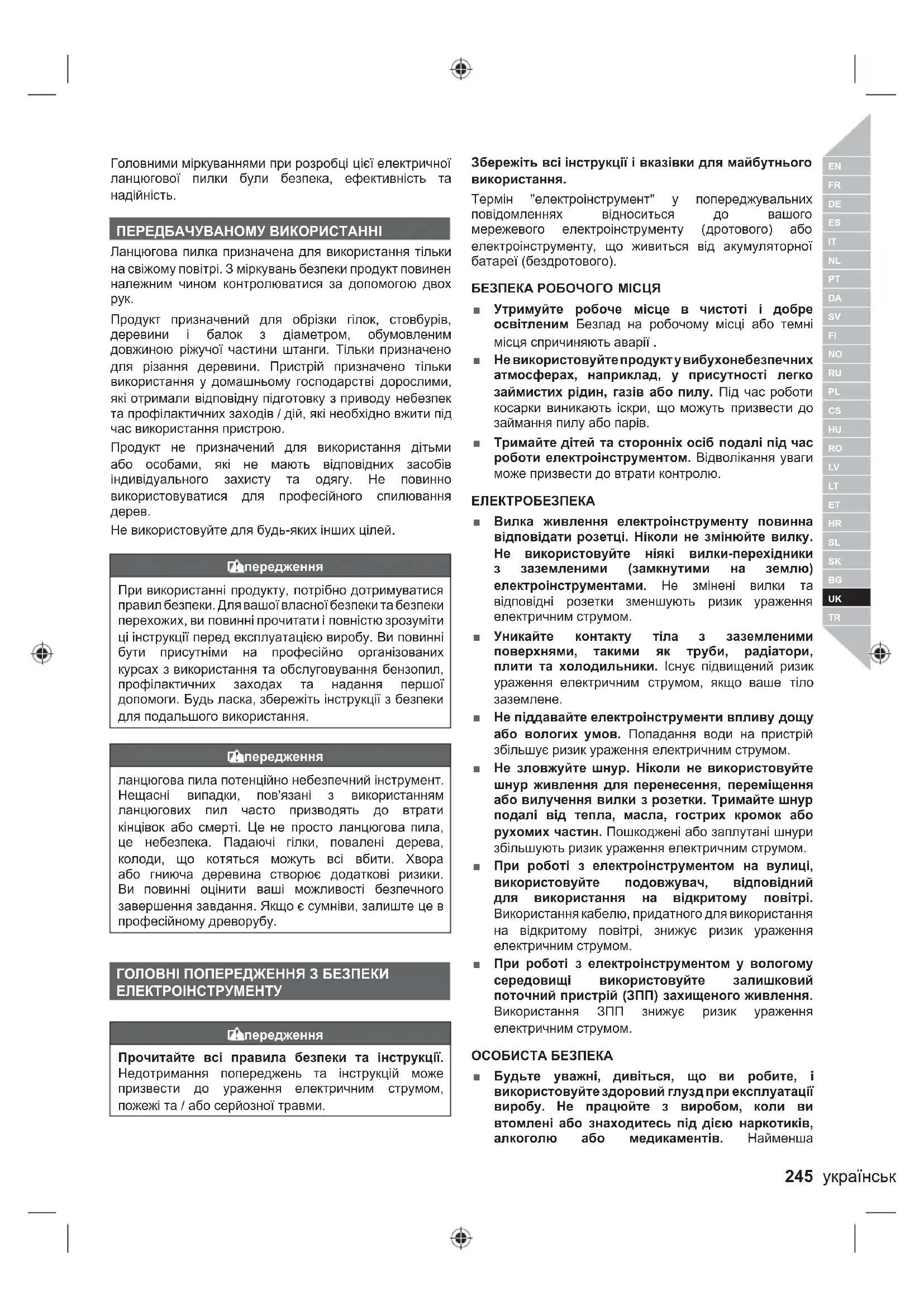 Не використовуйте для будь-яких інших цілей. Попередження При використанні продукту, потрібно дотримуватися правил безпеки. Для вашої власної безпеки та безпеки перехожих, ви повинні прочитати і повністю зрозуміти ці інструкції перед експлуатацією виробу. Ви повинні бути присутніми на професійно організованих курсах з використання та обслуговування бензопил, профілактичних заходах та надання першої допомоги. Будь ласка, збережіть інструкції з безпеки для подальшого використання. Попередження ланцюгова пила потенційно небезпечний інструмент. Нещасні випадки, пов'язані з використанням ланцюгових пил часто призводять до втрати кінцівок або смерті. Це не просто ланцюгова пила, це небезпека. Падаючі гілки, повалені дерева, колоди, що котяться можуть всі вбити. Хвора або гниюча деревина створює додаткові ризики. Ви повинні оцінити ваші можливості безпечного завершення завдання. Якщо є сумніви, залиште це в професійному древорубу. ГОЛОВНІ ПОПЕРЕДЖЕННЯ З БЕЗПЕКИ ЕЛЕКТРОІНСТРУМЕНТУ Попередження Прочитайте всі правила безпеки та інструкції. Недотримання попереджень та інструкцій може призвести до ураження електричним струмом, пожежі та / або серйозної травми. Збережіть всі інструкції і вказівки для майбутнього використання. Термін "електроінструмент" у попереджувальних повідомленнях відноситься до вашого мережевого електроінструменту (дротового) або електроінструменту, що живиться від акумуляторної батареї (бездротового). БЕЗПЕКА РОБОЧОГО