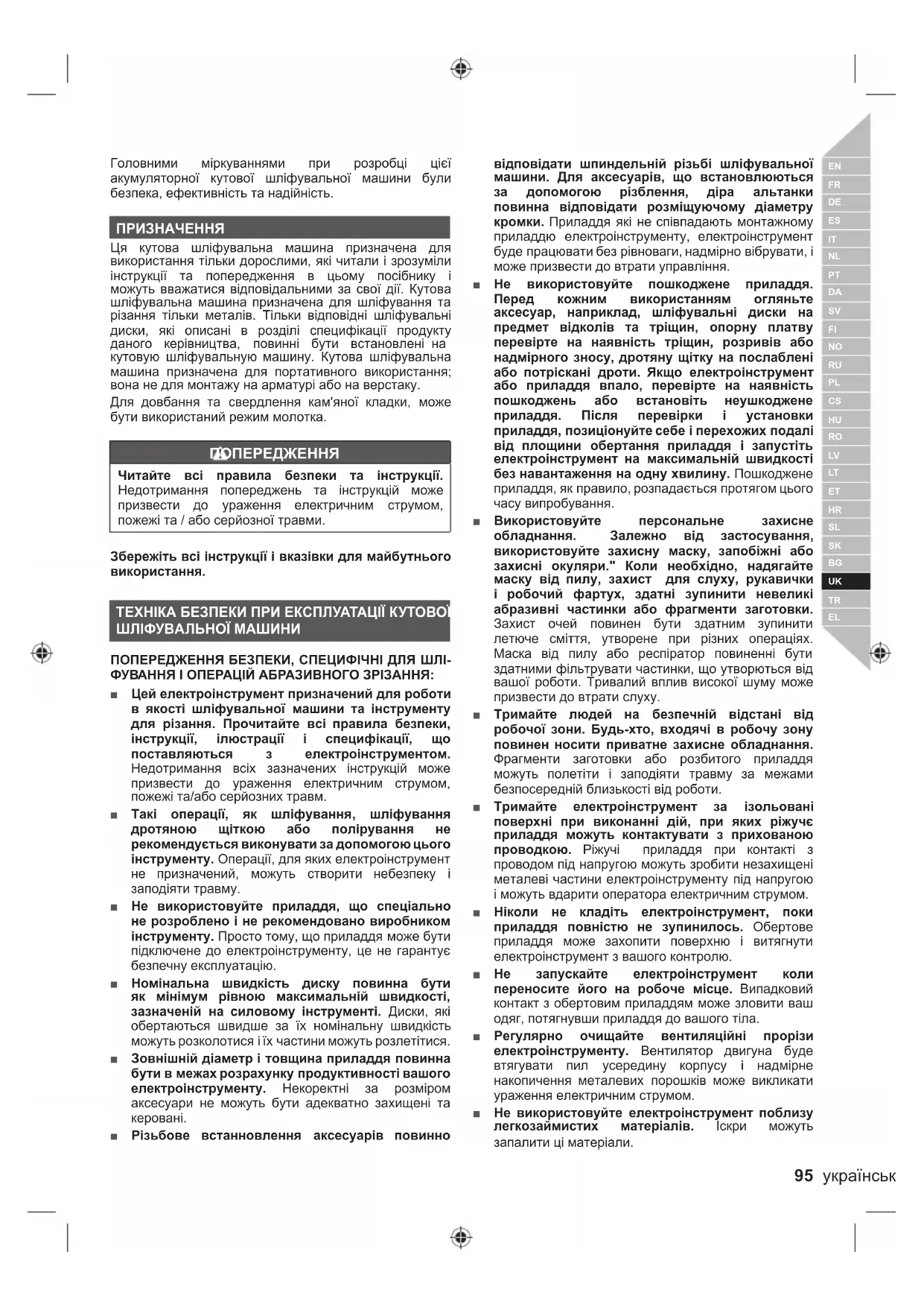 Головними міркуваннями при розробці цієї акумуляторної кутової шліфувальної машини були безпека, ефективність та надійність. ПРИЗНАЧЕННЯ Ця кутова шліфувальна машина призначена для використання тільки дорослими, які читали і зрозуміли інструкції та попередження в цьому посібнику і можуть вважатися відповідальними за свої дії. Кутова шліфувальна машина призначена для шліфування та різання тільки металів. Тільки відповідні шліфувальні диски, які описані в розділі специфікації продукту даного керівництва, повинні бути встановлені