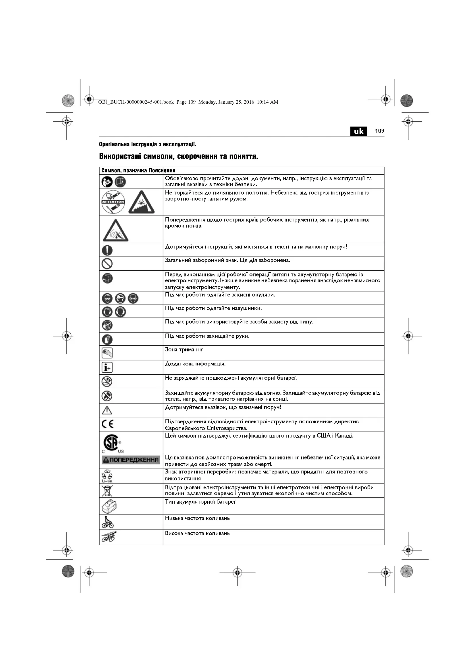 Не заряджайте пошкоджені акумуляторні батареї. Захищайте акумуляторну батарею від вогню. Захищайте акумуляторну батарею від тепла, напр., від тривалого нагрівання на сонці. Дотримуйтеся вказівок, що зазначені поруч! Підтвердження відповідності електроінструменту положенням директив Європейського Співтовариства. Цей символ підтверджує сертифікацію цього продукту в США і Канаді. Ця вказівка повідомляє про можливість виникнення небезпечної ситуації, яка може привести до серйозних травм або смерті. Знак вторинної переробки: позначає матеріали, що придатні для повторного використання Відпрацьовані електроінструменти та інші електротехнічні і електронні вироби повинні здаватися окремо і утилізуватися екологічно чистим способом. Тип акумуляторної батареї Низька частота коливань Висока частота коливань OBJ_BUCH-0000000245-001.book Page 109 Monday, January 25, 2016 10:14 AM110