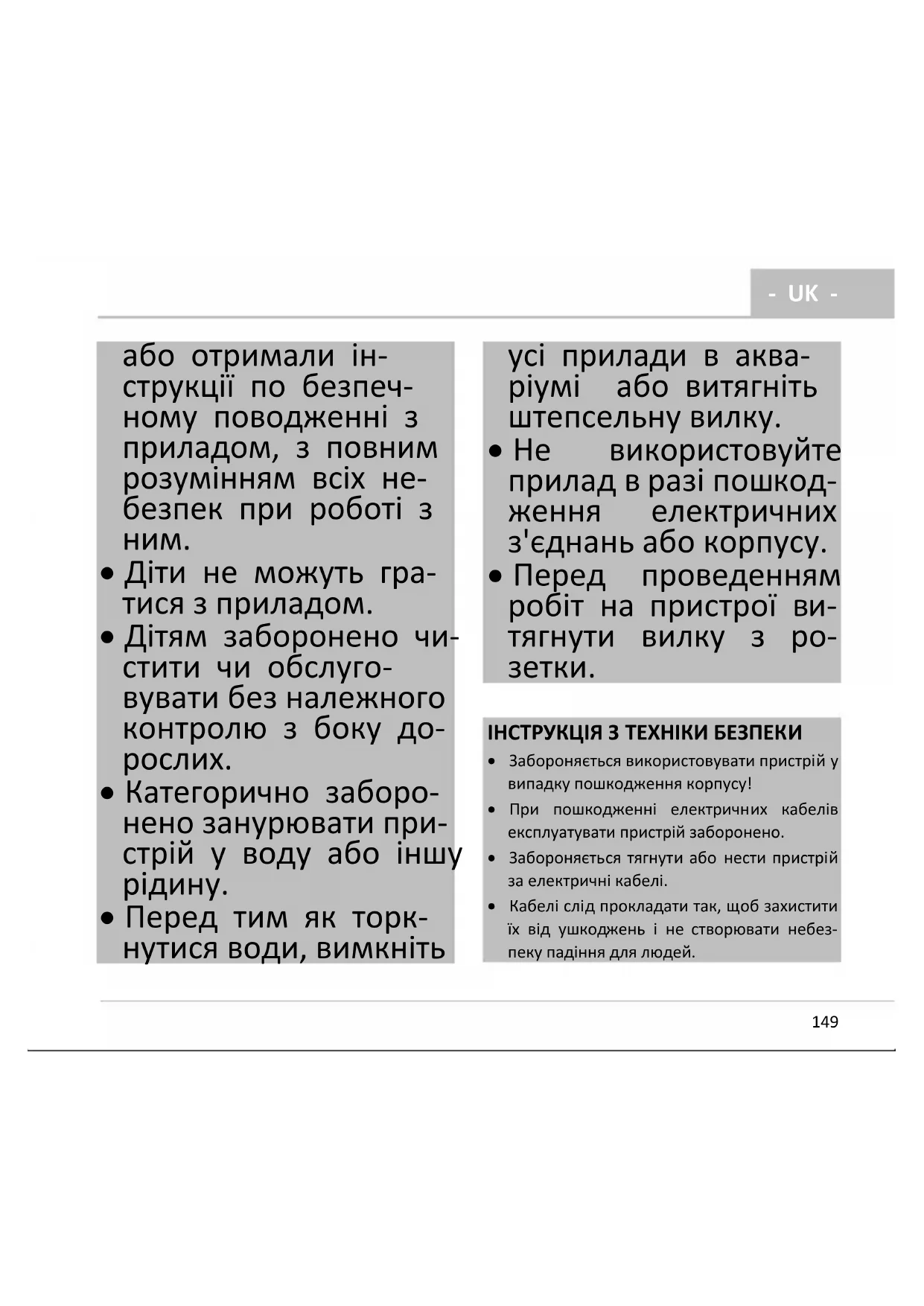 - З’єднувальні проводи не підлягають заміні. У разі пошкодження шнура пристрій необ- хідно утилізувати.