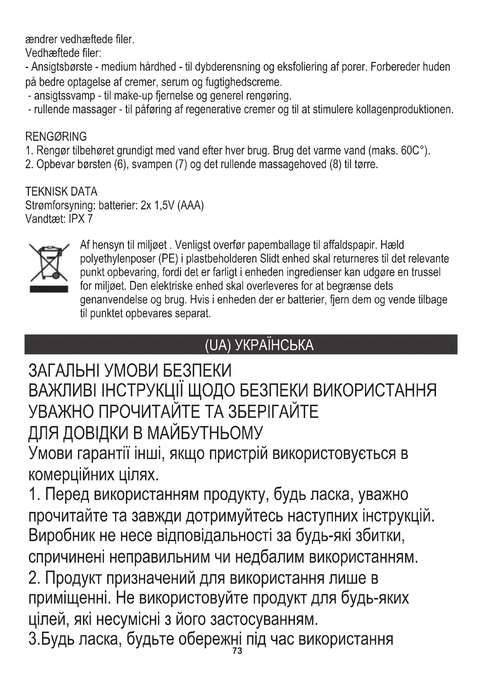 (6) Щітка для обличчя (7) Губка (8) Роликовий масажер Пристрій призначений для індивідуального використання як засіб для очищення та догляду за шкірою обличчя. Він забезпечує кругове обертання для ретельного та глибокого очищення. Не використовуйте його на тваринах.