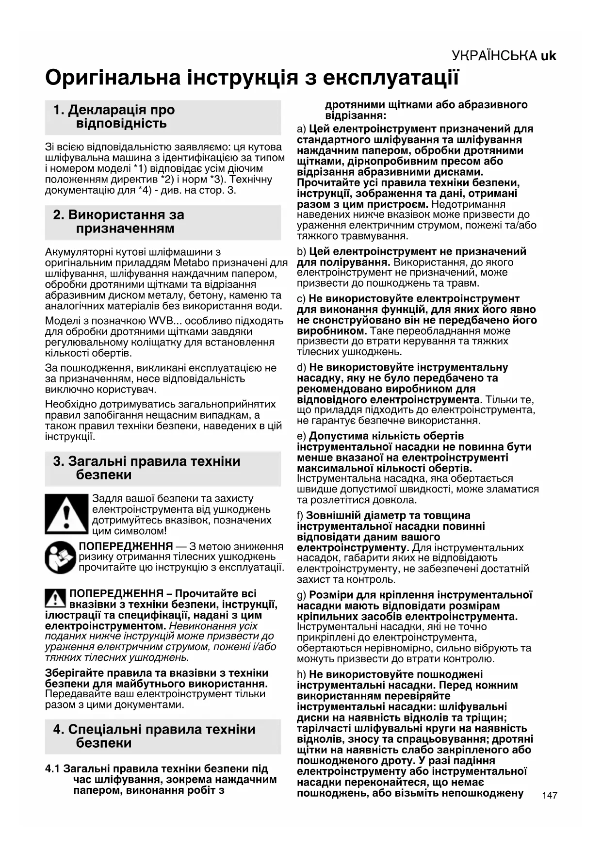 Оригінальна інструкція з експлуатації Зі всією відповідальністю заявляємо: ця кутова шліфувальна машина з ідентифікацією за типом і номером моделі *1) відповідає усім діючим положенням директив *2) і норм *3). Технічну документацію для *4) - див. на стор. 3. Акумуляторні кутові шліфмашини з оригінальним приладдям Metabo призначені для шліфування, шліфування наждачним папером, обробки дротяними щітками та відрізання абразивним диском металу, бетону, каменю та аналогічних матеріалів без використання води. Моделі з позначкою WVB... особливо підходять для обробки дротяними щітками завдяки регулювальному коліщатку для встановлення кількості обертів. За пошкодження, викликані експлуатацією не за призначенням, несе відповідальність виключно користувач. Необхідно дотримуватись загальноприйнятих правил запобігання нещасним випадкам, а також правил техніки безпеки, наведених в цій інструкції. Задля вашої безпеки та захисту електроінструмента від ушкоджень дотримуйтесь вказівок, позначених цим символом! ПОПЕРЕДЖЕННЯ — З метою зниження ризику отримання тілесних ушкоджень прочитайте цю інструкцію з експлуатації. ПОПЕРЕДЖЕННЯ – Прочитайте всі вказівки з техніки безпеки, інструкції, ілюстрації та специфікації, надані з цим електроінструментом. Невиконання усіх поданих нижче інструкцій може призвести до ураження електричним струмом, пожежі і/або тяжких тілесних ушкоджень. Зберігайте правила та вказівки з техніки безпеки для майбутнього використання. Передавайте ваш електроінструмент тільки разом з цими документами.