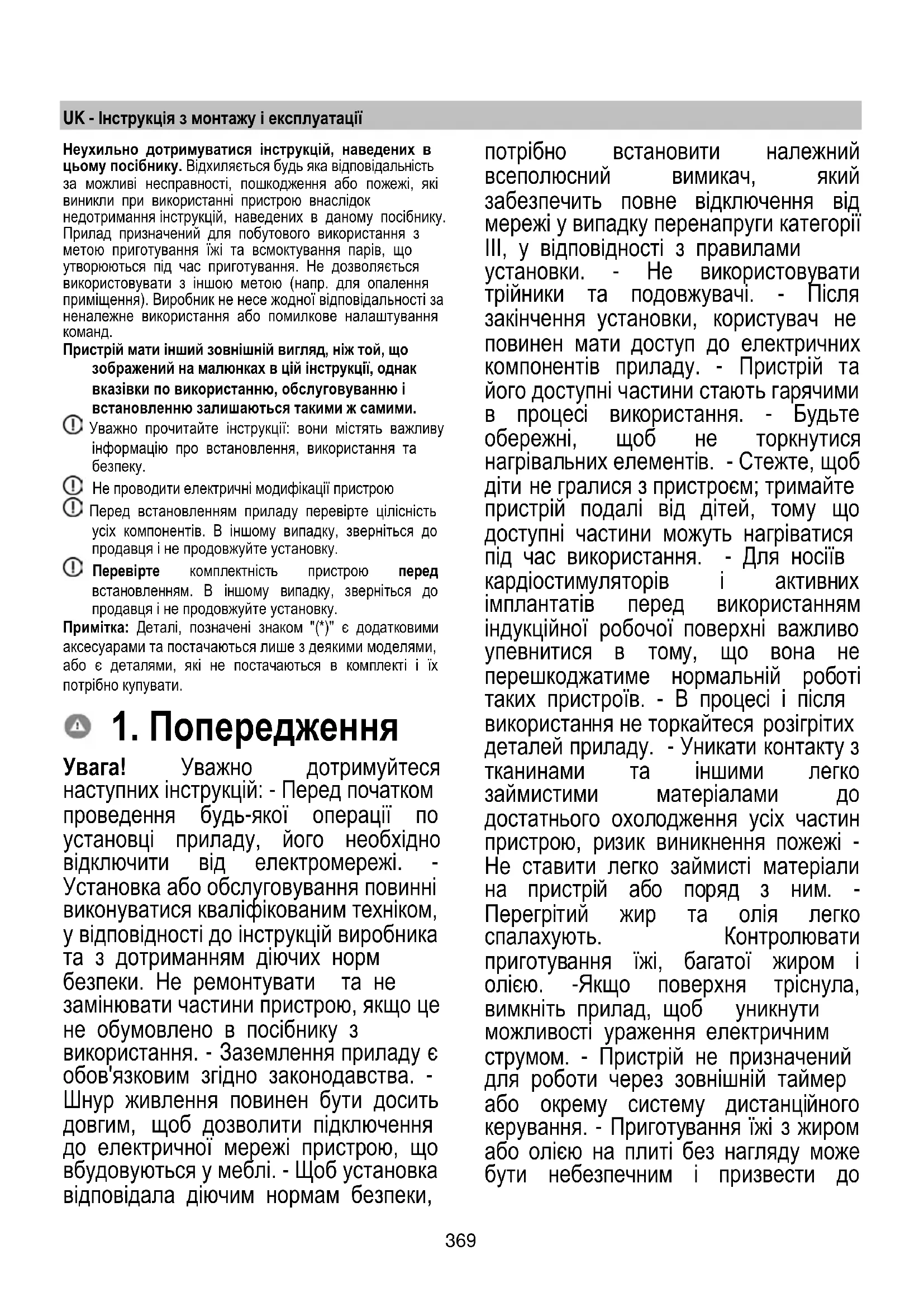 Если после вышеупомянутых проверок проблема не устранена, обратитесь в ближайшую службу технической поддержки.369 UK - Інструкція з монтажу і експлуатації Неухильно дотримуватися інструкцій, наведених в цьому посібнику. Відхиляється будь яка відповідальність за можливі несправності, пошкодження або пожежі, які виникли при використанні пристрою внаслідок недотримання інструкцій, наведених в даному посібнику. Прилад призначений для побутового використання з метою приготування їжі та всмоктування парів, що утворюються під час приготування. Не дозволяється використовувати з іншою метою (напр. для опалення приміщення). Виробник не несе жодної відповідальності за неналежне використання або помилкове налаштування