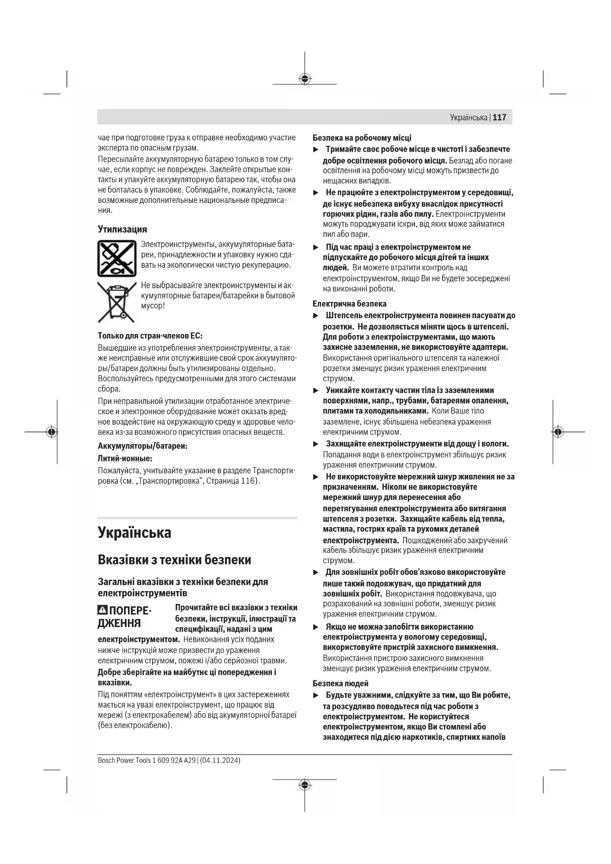 У разі неправильної утилізації відпрацьоване електричне та електронне обладнання може мати шкідливий вплив на навколишнє середовище та здоров'я людей через можливу наявність небезпечних речовин. Bosch Power Tools 1 609 92A A29 | (04.11.2024)124 | Қазақ Акумулятори/батарейки: Літієво-іонні: Будь ласка, зважайте на вказівки в розділі Транспортування (див. „Транспортування“, Сторінка123).