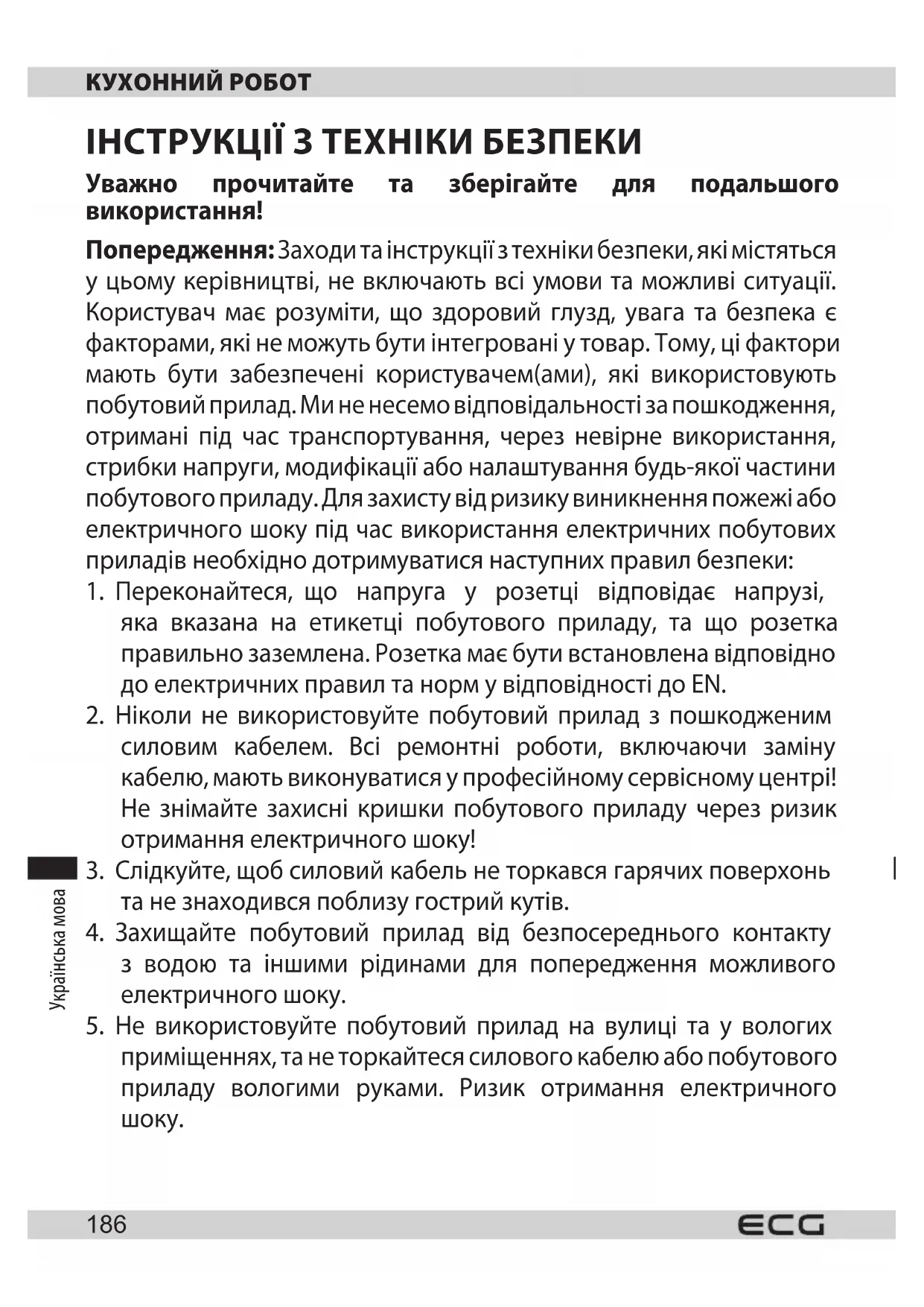 ТЕХНІЧНІ ДАНІ Номінальна напруга: 220-240 В ~ 50-60 Гц Номінальна потужність на вході: 1500 Вт Об’єм чаші з нержавіючої сталі: 6,5 л Обсяг міксера: 1,5 л ВИКОРИСТАННЯ ТА УТИЛІЗАЦІЯ ВІДХОДІВ Пакувальний папір та гофрований картон - до смітника. Пакувальна фольга, ПЕ коробки, пластикові елементи - до контейнерів для переробки пластику. УТИЛІЗАЦІЯ ПРОДУКТІВ ПІСЛЯ ЗАВЕРШЕННЯ СТРОКУ ЕКСПЛУАТАЦІЇ Утилізуйте електричне та електронне обладнання (діє у країнах-членах ЄС та інших європейських країнах з впровадженою системою переробки) Представлений символ на продукті або упаковці означає, що продукт не повинен викидатися до побутового сміття. Продукт необхідно віднести до спеціального місця для переробки електричного та електронного обладнання. Вірна переробка продукту попереджує негативний вплив на здоров’я людей та екологію. Переробка вносить свій вклад до збереження природних ресурсів. Для отримання більш детальної інформації про переробку цього продукту зверніться до місцевих органів, організацій з переробки побутових відходів або до магазину, де ви придбали продукт. Цей продукт відповідає директивам ЄС щодо електромагнітної сумісності та електробезпеки, використання важких металів у електричному та електронному обладнанні. Більш того, продукт відповідає вимогам до електроспоживання та вимогам для безпосереднього контракту з продуктами харчування. Керівництво користувача доступне на вебсайті www.ecg-electro.eu. Текст та технічні параметри можуть бути змінені. 08/05 Tootja ei vastuta toote kasutusjuhendis leiduvate trükivigade eest. El fabricante no asume ninguna responsabilidad por errores de impresión en el manual del usuario del producto. Le fabricant ne peut être tenu responsable des erreurs d’impression contenues dans le mode d’emploi du produit. Proizvođač ne snosi odgovornost za tiskarske greške u uputama. Il produttore non sarà ritenuto responsabile per eventuali errori di stampa contenuti nel manuale d’uso del prodotto. Ražotājs neuzņemas atbildību par drukas kļūdām ierīces rokasgrāmatā. Gamintojas neapsiima atsakomybės dėl spausdinimo klaidų, pasitaikančių gaminio naudotojo vadove. Agyártó nem felel a termék használati útmutatójában fellelhető nyomdahibákért. Producent nie ponosi odpowiedzialności za błędy drukarskie winstrukcji obsługi produktu. Producătorul nu își asumă nicio responsabilitate pentru erorile de imprimare conținute în manualul utilizatorului produsului. Dovozca neručí za tlačové chyby obsiahnuté v návode na použitie výrobku. Proizvajalec ne jamči za morebitne tiskovne napake v navodilih za uporabo izdelka. Proizvođač ne preuzima nikakvu odgovornost za štamparske greške sadržane uuputstvu za upotrebu proizvoda. Ο κατασκευαστής δεν φέρει καμία ευθύνη για τα τυπογραφικά σφάλματα που περιέχονται στο εγχειρίδιο χρήστη του προϊόντος. Виробник не несе відповідальності за помилки друку, що містяться в посібнику користувача продукту. © GVS.cz 2022 www.ecg-electro.eu Eesti keel K+B Progres, a.s. UExpertu 91 tel.: +420 272 122 111 250 69 Klíčany, Czech Rep. e-post: ECG@kbexpert.cz Español K+B Progres, a.s. UExpertu 91 tel.: +44 776 128 6651 (English) 250 69 Klíčany, Czech Rep. e-mail: ECG@kbexpert.cz Français K+B Progres, a.s. UExpertu 91 tél: +44 776 128 6651 (English) 250 69 Klíčany, Czech Rep. e-mail: ECG@kbexpert.cz Hrvatski K+B Progres, a.s. UExpertu 91 tel.: +420 272 122 111 250 69 Klíčany, Czech Rep. e-mail: informacije@kbprogres.cz Bosanski K+B Progres, a.s. UExpertu 91 tel.: +420 272 122 111 250 69 Klíčany, Czech Rep. e-mail: informacije@kbprogres.cz Italiano K+B Progres, a.s. 1UExpertu 91 tel.: +44 776 128 6651 (English) 250 69 Klíčany, Czech Rep. e-mail: ECG@kbexpert.cz Latviešu valoda K+B Progres, a.s. UExpertu 91 tel.: +420 272 122 111 250 69 Klíčany, Czech Rep. e-pasts: ECG@kbexpert.cz Lietuvių kalba K+B Progres, a.s. UExpertu 91 tel.: +420 272 122 111 250 69 Klíčany, Czech Rep. el. paštas: ECG@kbexpert.cz Magyar K+B Progres, a.s. UExpertu 91 tel.: +420 272 122 111 250 69 Klíčany, Czech Rep. e-mail: ECG@kbexpert.cz Polski K+B Progres, a.s. UExpertu 91 tel.: +420 272 122 111 250 69 Klíčany, Czech Rep. e-mail: ECG@kbexpert.cz Română K+B Progres, a.s. UExpertu 91 tel.: +420 272 122 111 250 69 Klíčany, Czech Rep. e-mail: ECG@kbexpert.cz Slovenčina Distribútor pre SR: K+B Progres, a. s., organizačná zložka Mlynské Nivy 71 821 05 Bratislava e-mail: ECG@kbexpert.cz Slovenščina K+B Progres, a.s. UExpertu 91 tel.: +420 272 122 111 250 69 Klíčany, Czech Rep. e-mail: informacije@kbprogres.cz Sr