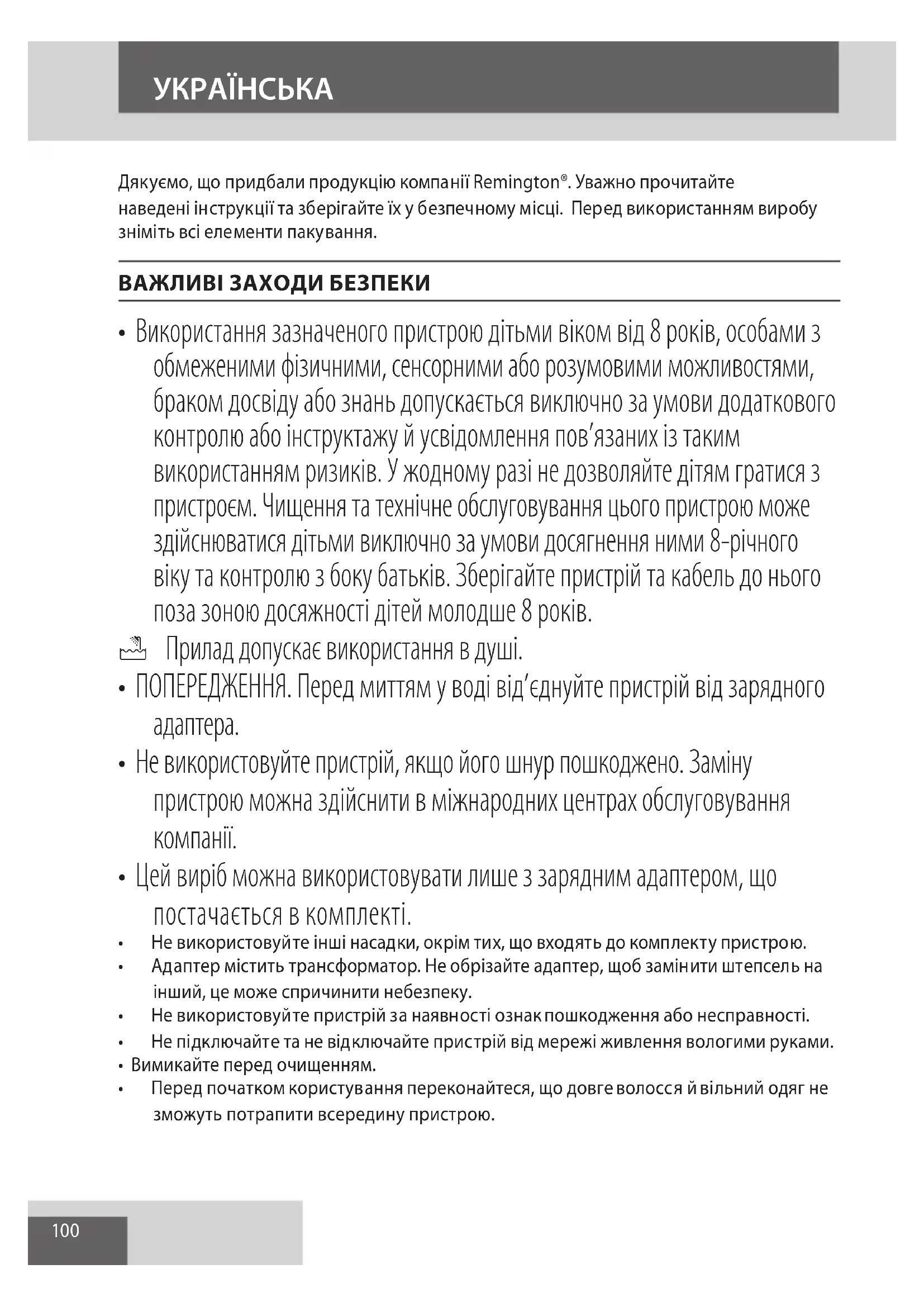 HRVATSKI JEZIK100 Дякуємо, що придбали продукцію компанії Remington®. Уважно прочитайте наведені інструкції та зберігайте їх у безпечному місці. Перед використанням виробу зніміть всі елементи пакування. ВАЖЛИВІ ЗАХОДИ БЕЗПЕКИ