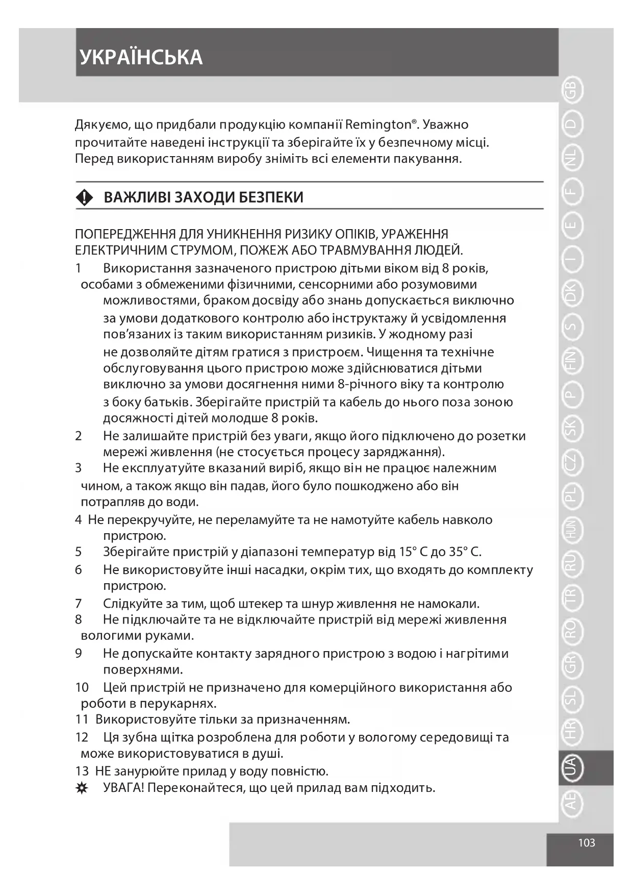 Kako bi se izbjegle štetne posljedice na okoliš i zdravlje zbog opasnih supstanci u električnim i elektronskim proizvodima, svi uređaji obilježeni ovim simbolom ne smiju se zbrinjavati kao nerazvrstani komunalni otpad, već se moraju prikupiti, ponovno koristiti ili reciklirati. HRVATSKI JEZIK103 Дякуємо, що придбали продукцію компанії Remington®. Уважно прочитайте наведені і нструкції та зберігайте їх у безпечному місці. Перед використанням виробу зніміть всі елементи пакування. F ВАЖЛИВІ ЗАХОДИ БЕЗПЕКИ ПОПЕРЕДЖЕННЯ ДЛЯ УНИКНЕННЯ РИЗИКУ ОПІКІВ, УРАЖЕННЯ ЕЛЕКТРИЧНИМ СТРУМОМ, ПОЖЕЖ АБО ТРАВМУВАННЯ ЛЮДЕЙ. 1 Використання зазначеного пристрою дітьми віком від 8 років, особами з обмеженими фізичними, сенсорними або розумовими можливостями, браком досвіду або знань допускається виключно за умови додаткового контролю або інструктажу й усвідомлення пов’язаних із таким використанням ризиків. У жодному разі не дозволяйте дітям гратися з пристроєм. Чищення та технічне обслуговування цього пристрою може здійснюватися дітьми виключно за умови досягнення ними 8-річного віку та контролю з боку батьків. Зберігайте пристрій та кабель до нього поза зоною досяжності дітей молодше 8 років. 2 Не залишайте пристрій без уваги, якщо його підключено до розетки мережі живлення (не стосується процесу заряджання). 3 Не експлуатуйте вказаний виріб, якщо він не працює належним чином, а також якщо він падав, його було пошкоджено або він потрапляв до води. 4 Не перекручуйте, не переламуйте та не намотуйте кабель навколо