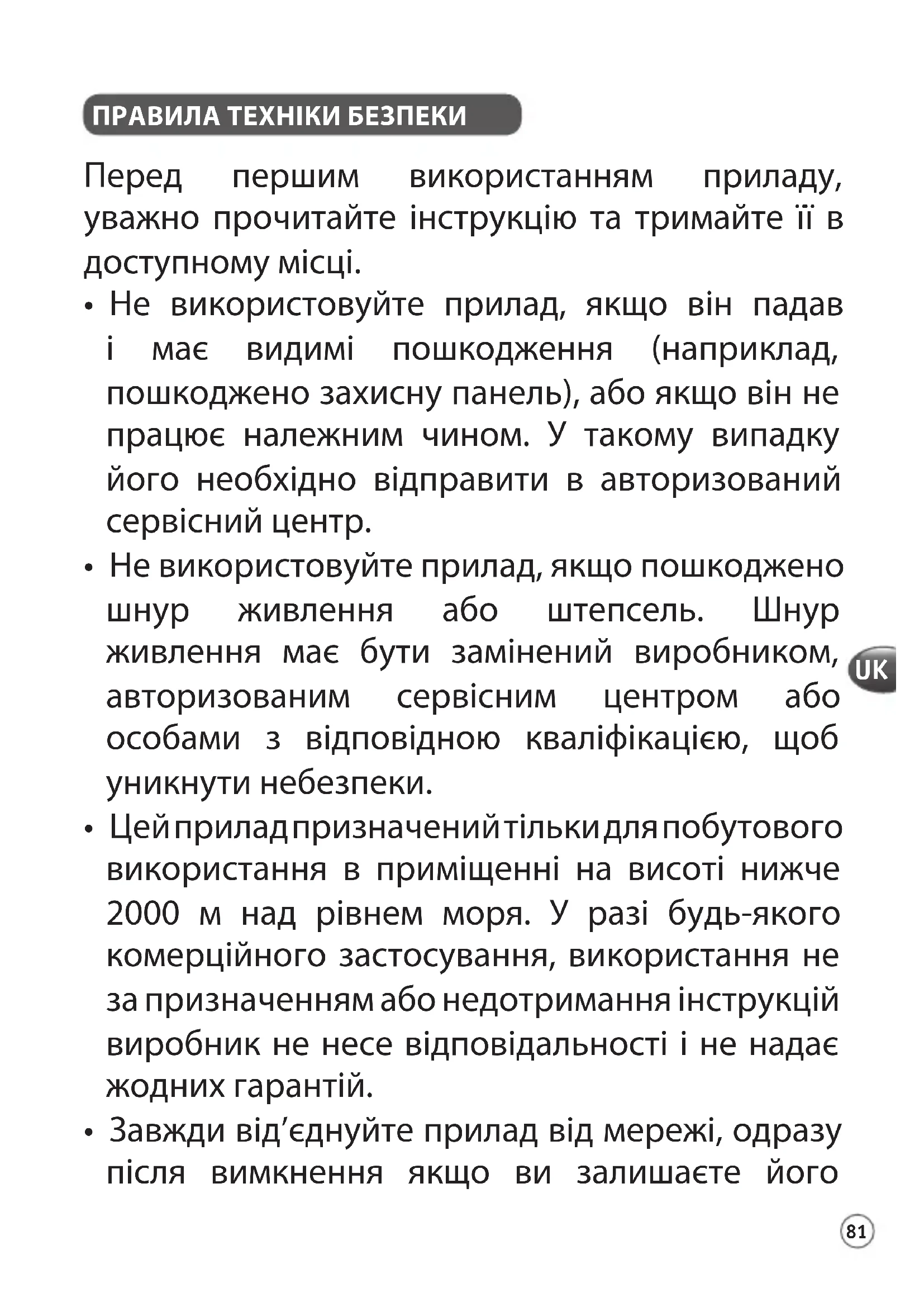 ПРАВИЛА ТЕХНІКИ БЕЗПЕКИ Перед першим використанням приладу, уважно прочитайте інструкцію та тримайте її в доступному місці.
