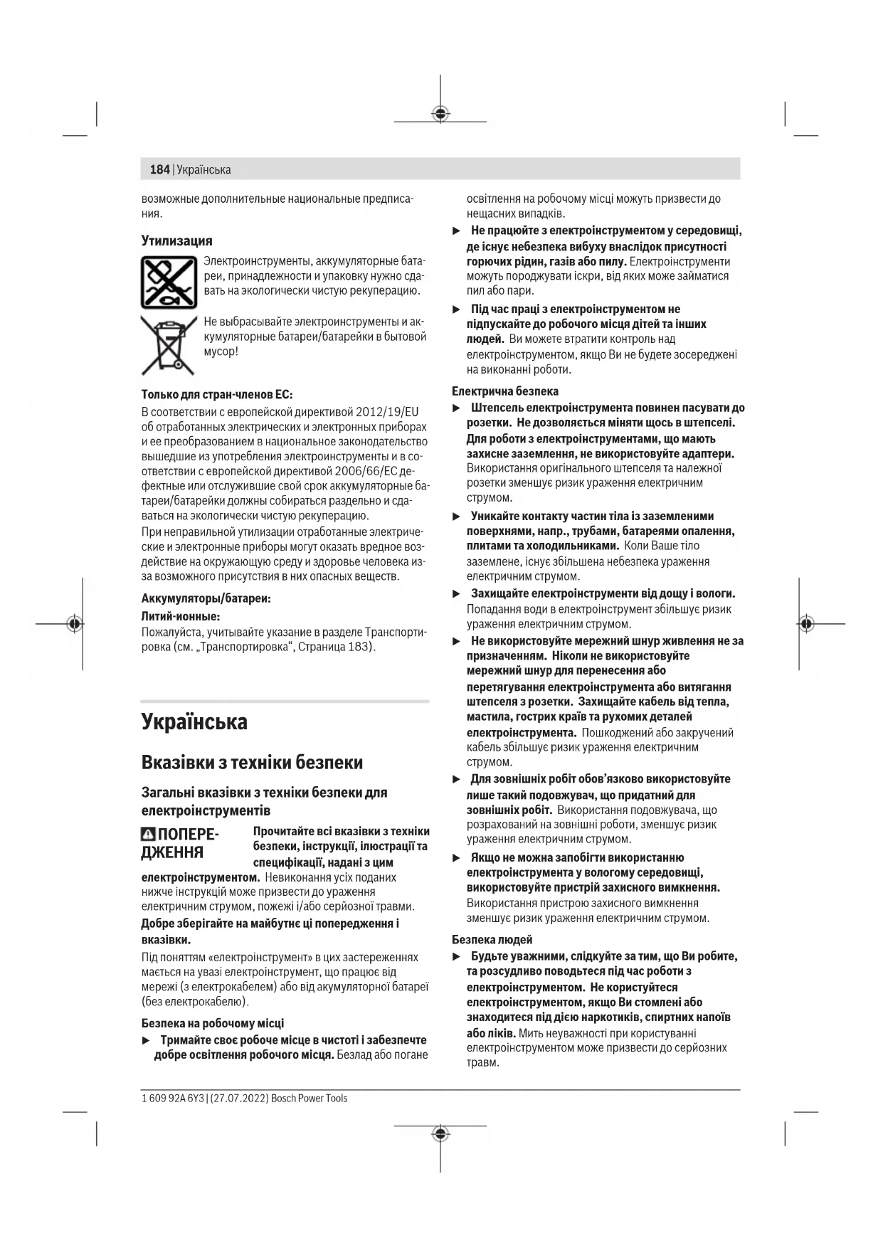 Лише для країнЄС: Відповідно до Європейської Директиви 2012/19/EU щодо відходів електричного та електронного обладнання та її перетворення в національне законодавство електроінструменти, які більше не придатні до використання, а також відповідно до Європейської Директиви 2006/66/EC несправні або відпрацьовані акумуляторні батареї/батарейки повинні здаватися окремо і утилізуватися екологічно чистим способом. При неправильній утилізації відпрацьовані електричні та електронні прилади можуть мати шкідливий вплив на навколишнє середовище та здоров’я людини через можливу наявність небезпечних речовин. Акумулятори/батарейки: Літієво-іонні: Будь ласка, зважайте на вказівки в розділі Транспортування (див. „Транспортування“, Сторінка194).