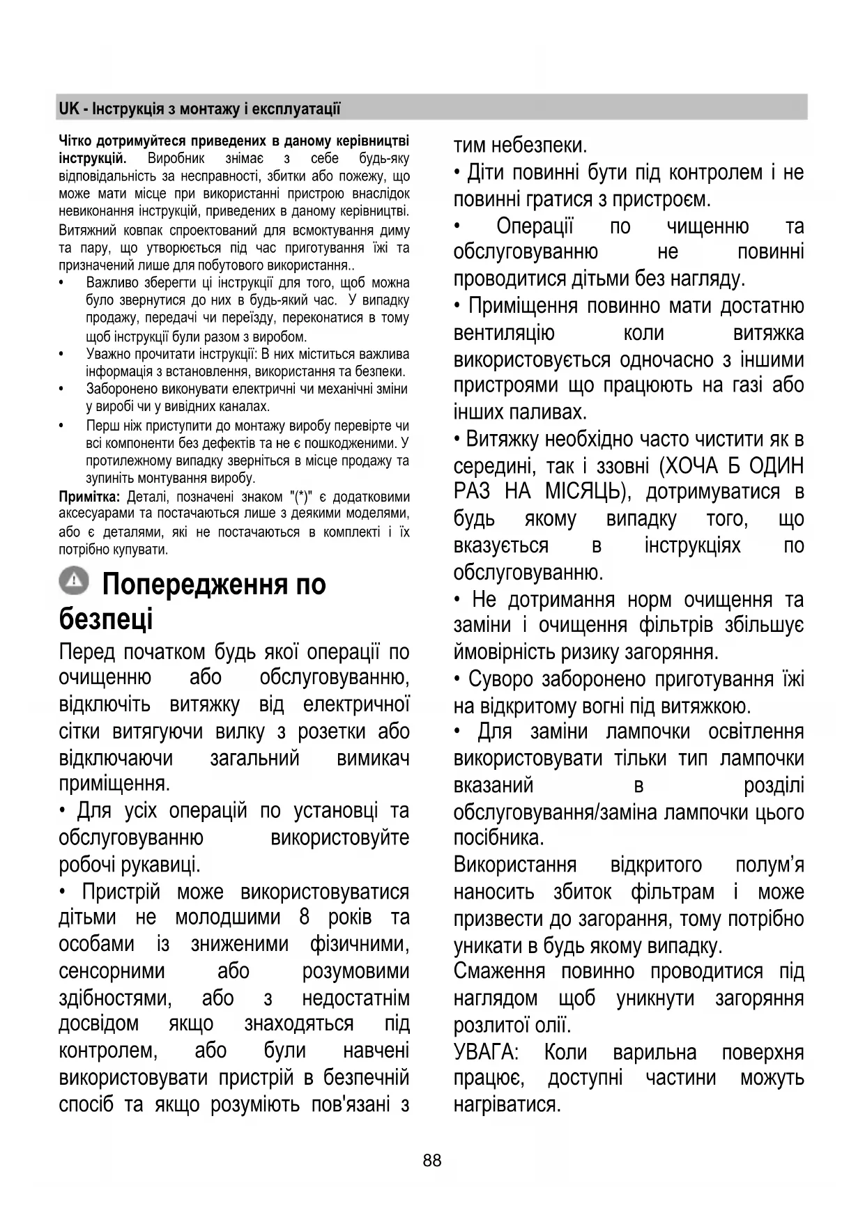- Витяжка НІКОЛИ не повинна використовуватися як опорна поверхня, якщо тільки не вказується.