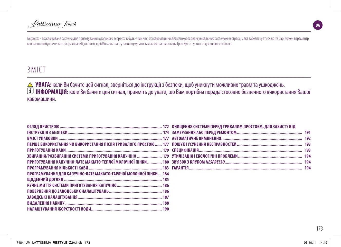 УВАГА: коли Ви бачите цей сигнал, зверніться до інструкції з безпеки, щоб уникнути можливих травм та ушкоджень. ІНФОРМАЦІЯ: коли Ви бачите цей сигнал, прийміть до уваги, що Вам портібна порада стосовно безпечного використання Вашої кавомашини. ОГЛЯД ПРИСТРОЮ 172 ІНСТРУКЦІЯ З БЕЗПЕКИ 174 ВМІСТ УПАКОВКИ 177 ПЕРШЕ ВИКОРИСТАННЯ ЧИ ВИКОРИСТАННЯ ПІСЛЯ ТРИВАЛОГО ПРОСТОЮ 177 ПРИГОТУВАННЯ КАВИ 179 ЗБИРАННЯ/РОЗБИРАННЯ СИСТЕМИ ПРИГОТУВАННЯ КАПУЧІНО 179 ПРИГОТУВАННЯ КАПУЧІНО-ЛАТЕ МАКІАТО-ТЕПЛОЇ МОЛОЧНОЇ ПІНКИ 180 ПРОГРАМУВАННЯ КІЛЬКОСТІ КАВИ 183 ПРОГРАМУВАННЯ ДЛЯ КАПУЧІНО-ЛАТЕ МАКІАТО-ГАРЯЧОЇ МОЛОЧНОЇ ПІНКИ 184 ЩОДЕННИЙ ДОГЛЯД 185 РУЧНЕ МИТТЯ СИСТЕМИ ПРИГОТУВАННЯ КАПУЧІНО 186 ПОВЕРНЕННЯ ДО ЗАВОДСЬКИХ НАЛАШТУВАНЬ 186 ЗАВОДСЬКІ НАЛАШТУВАННЯ 187 ВИДАЛЕННЯ НАКИПУ 188 НАЛАШТУВАННЯ ЖОРСТКОСТІ ВОДИ 190 ОЧИЩЕННЯ СИСТЕМИ ПЕРЕД ТРИВАЛИМ ПРОСТОЄМ, ДЛЯ ЗАХИСТУ ВІД ЗАМЕРЗАННЯ АБО ПЕРЕД РЕМОНТОМ АВТОМАТИЧНЕ ВИМКНЕННЯ ПОШУК І УСУНЕННЯ НЕСПРАВНОСТЕЙ СПЕЦИФІКАЦІЯ УТИЛІЗАЦІЯ І ЕКОЛОГІЧНІ ПРОБЛЕМИ ЗВ'ЯЗОК З КЛУБОМ NESPRESSO