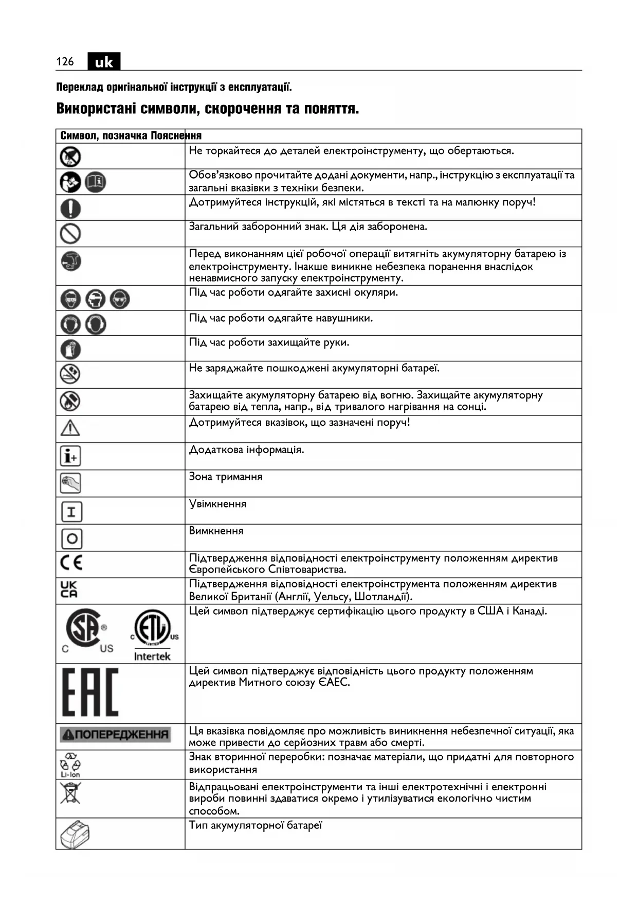 Переклад оригінальної інструкції з експлуатації. Використані символи, скорочення та поняття. Символ, позначка Пояснення Не торкайтеся до деталей електроінструменту, що обертаються. Обов’язково прочитайте додані документи, напр., інструкцію з експлуатації та загальні вказівки з техніки безпеки. Дотримуйтеся інструкцій, які містяться в тексті та на малюнку поруч! Загальний заборонний знак. Ця дія заборонена. Перед виконанням цієї робочої операції витягніть акумуляторну батарею із електроінструменту. Інакше виникне небезпека поранення внаслідок ненавмисного запуску електроінструменту. Під час роботи одягайте захисні окуляри. Під час роботи одягайте навушники. Під час роботи захищайте руки. Не заряджайте пошкоджені акумуляторні батареї. Захищайте акумуляторну батарею від вогню. Захищайте акумуляторну батарею від тепла, напр., ві д тривалого нагрівання на сонці. Дотримуйтеся вказівок, що зазначені поруч! Додаткова інформація. Зона тримання