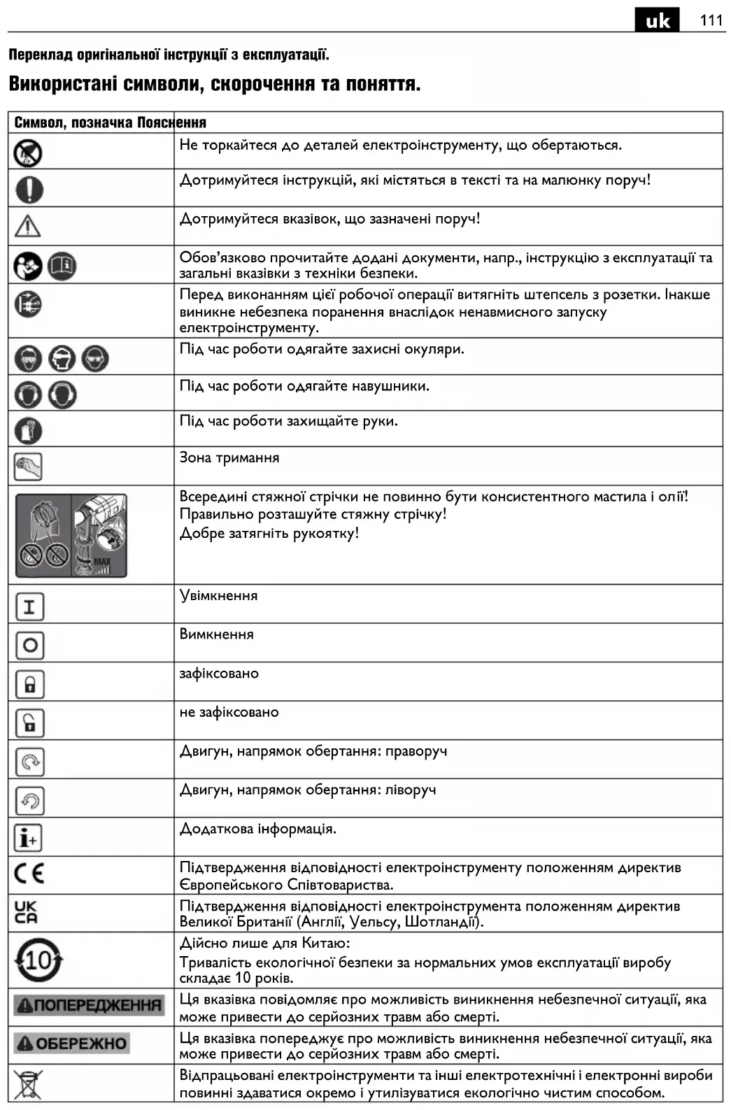 Переклад оригінальної інструкції з експлуатації. Використані символи, скорочення та поняття. Символ, позначка Пояснення Не торкайтеся до деталей електроінструменту, що обертаються. Дотримуйтеся інструкцій, які містяться в тексті та на малюнку поруч! Дотримуйтеся вказівок, що зазначені поруч! Обов’язково прочитайте додані документи, напр., інструкцію з експлуатації та загальні вказівки з техніки безпеки. Перед виконанням цієї робочої операції витягніть штепсель з розетки. Інакше виникне небезпека поранення внаслідок ненавмисного запуску електроінструменту. Під час роботи одягайте захисні окуляри. Під час роботи одягайте навушники. Під час роботи захищайте руки. Зона тримання Всередині стяжної стрічки не повинно бути консистентного мастила і ол