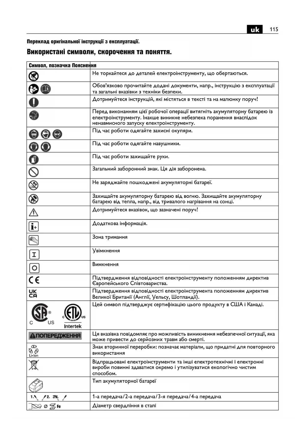 Підтвердження відповідності електроінструменту положенням директив Європейського Співтовариства. Підтвердження відповідності електроінструмента положенням директив Великої Британії (Англії, Уельсу, Шотландії). Цей символ підтверджує сертифікацію цього продукту в США і Канаді. Ця вказівка повідомляє про можливість виникнення небезпечної ситуац