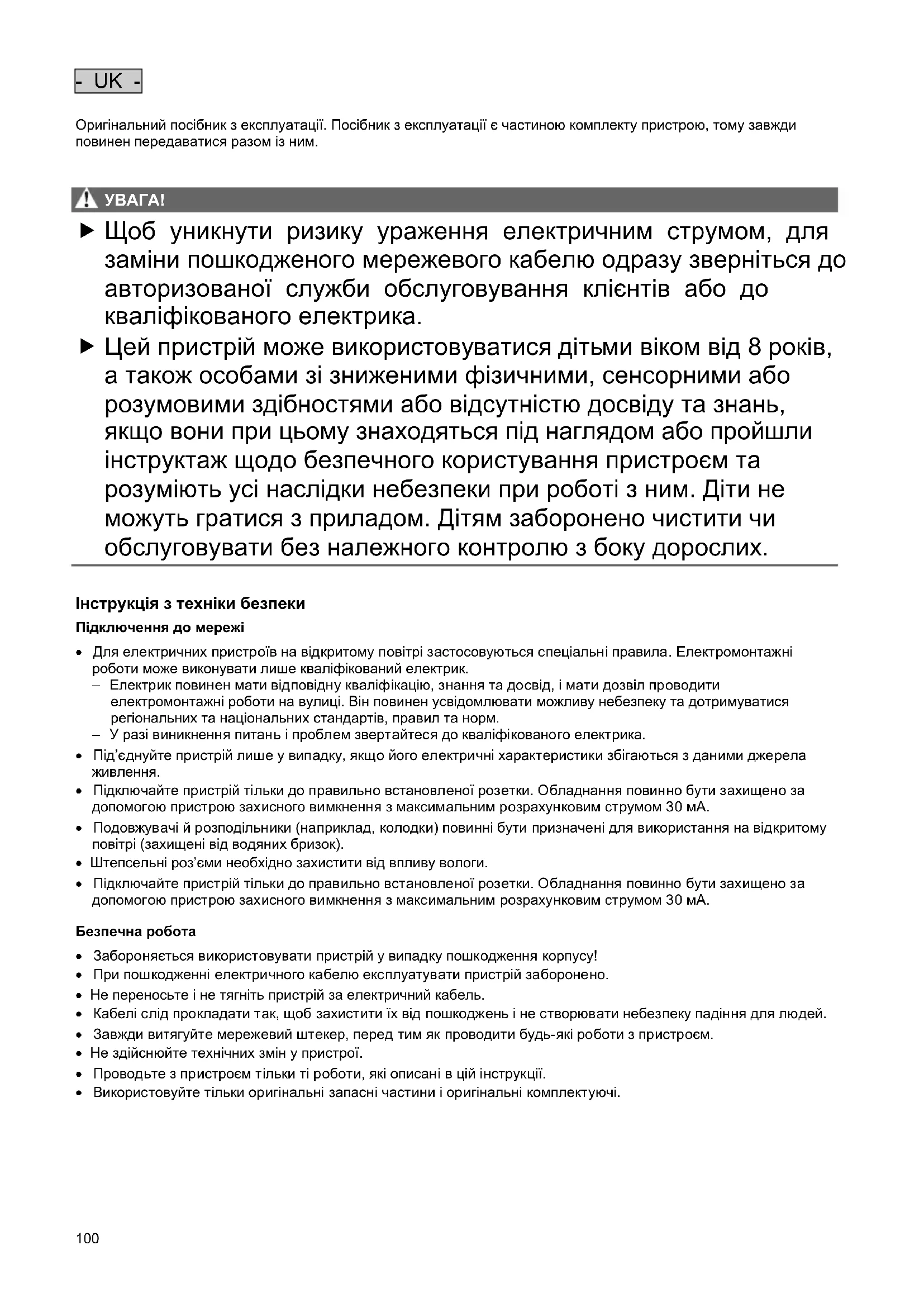 Щоб уникнути ризику ураження електричним струмом, для заміни пошкодженого мережевого кабелю одразу зверніться до авторизованої служби обслуговування клієнтів або до кваліфікованого електрика. Цей пристрій може використовуватися дітьми віком від 8 років, а також особами зі зниженими фізичними, сенсорними або розумовими здібностями або відсутністю досвіду та знань, якщо вони при цьому знаходяться під наглядом або пройшли інструктаж щодо безпечного користування пристроєм та розуміють усі наслідки небезпеки при роботі з ним. Діти не можуть гратися з приладом. Дітям заборонено чистити чи обслуговувати без належного контролю з боку дорослих.