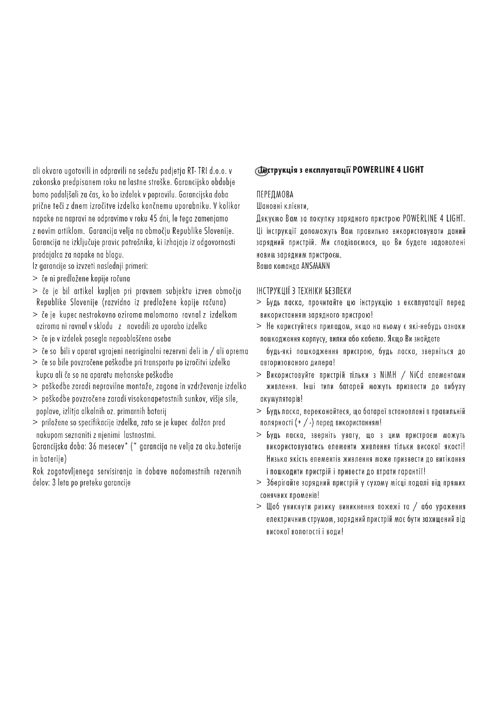 Шановні клієнти, Дякуємо Вам за покупку зарядного пристрою POWERLINE 4 LIGHT. Ці інструкції допоможуть Вам правильно використовувати даний зарядний пристрій. Ми сподіваємося, що Ви будете задоволені новим зарядним пристроєм. Ваша команда ANSMANN ІНСТРУКЦІЇ З ТЕХНІКИ БЕЗПЕКИ > Будь ласка, прочитайте цю інструкцію з експлуатації перед використанням зарядного пристрою! > Не користуйтеся приладом, якщо на ньому є які-небудь ознаки пошкодження корпусу, вилки або кабелю. Якщо Ви знайдете будь-які пошкодження пристрою, будь ласка, зверніться до авторизованого дилера! > Використовуйте пристрій тільки з NiMH / NiCd елементами живлення. Інші типи батарей можуть призвести до вибуху акумуляторів! > Будь ласка, переконайтеся, що батареї встановлені в правильній полярності (+ / -) перед використанням! > Будь ласка, зверніть увагу, що з цим пристроєм можуть використовуватись елементи живлення тільки високої якості! Низька якість елементів живлення може призвести до витікання і пошкодити пристрій і привести до втрати гарантії! > Збері гайте зарядний пристрій у сухому місці подалі від прямих сонячних променів! > Щоб уникнути ризику виникнення пожежі та / або ураження електричним струмом, зарядний пристрій має бу ти захищений від високої вологості і води!> Перед чищенням приладу, відключіть його від мережі і використовуйте тільки суху тканину! > Ніколи не намагайтеся відкрити зарядний пристрій! > Зберігати в недоступному для дітей місці! Діти повинні бути під наглядом, щоб вони не гралися з зарядним пристроєм або з мережею живлення! > Пристрій не повинен використовуватися дітьми або людьми з обмеженими фізичними, сенсорними або психічними можливостями. Крім того, починаючі користувачі, які ще не повністю прочитали ці інструкції повинні перебувати під наглядом перед використанням! > Якщо не дотримуватись правил техніки безпеки, це може призвести до пошкодження пристрою або акумулятора і може призвести до травми! > Ми рекомендуємо використовувати акумулятори ANSMANN з цим