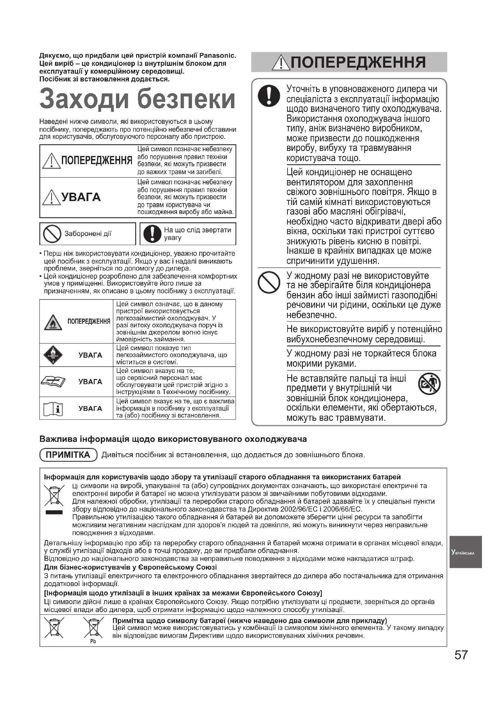 воздуха или воды 00_330260_all.indb 56 2020/11/23 13:35:3157 УКРАЇНСЬКАДякуємо, що придбали цей пристрій компанії Panasonic.Цей виріб – це кондиціонер із внутрішнім блоком для експлуатації у комерційному середовищі.Посібник зі встановлення додається. Заходи безпеки Наведені нижче символи, які використовуються в цьому посібнику, попереджають про потенційно небезпечні обставини для користувачів, обслуговуючого персоналу або пристрою. ПОПЕРЕДЖЕННЯ Цей символ позначає небезпеку або порушення правил техніки безпеки, які можуть призвести до важких травм чи загибелі. Цей символ позначає небезпеку або порушення правил техніки безпеки, які можуть призвести до травм користувача чи пошкодження виробу або майна.Заборонені діїНа що слід звертати увагу• Перш ніж використовувати кондиціонер, уважно прочитайте цей посібник з експлуатації. Якщо у вас і надалі виникають проблеми, зверніться по допомогу до дилера.• Цей кондиціонер розроблено для забезпечення комфортних умов у приміщенні. Використовуйте його лише за призначенням, як описано в цьому посібнику з експлуатації. Уточніть в уповноваженого дилера чи спеціаліста з експлуатації інформацію щодо визначеного типу охолоджувача. Використання охолоджувача іншого типу, аніж визначено виробником, може призвести до пошкодження виробу, вибуху та травмування користувача тощо. Цей кондиціонер не оснащено вентилятором для захоплення свіжого зовнішнього повітря. Якщо в тій самій кімнаті використовуються газові або масляні обігрівачі, необхідно часто відкривати двері або вікна, оскільки такі пристрої суттєво знижують рівень кисню в повітрі. Інакше в крайніх випадках це може спричинити удушення. У жодному разі не використовуйте та не зберігайте біля кондиціонера бензин або інші займисті газоподібні речовини чи рідини, оскільки це дуже небезпечно. Не використовуйте виріб у потенційно вибухонебезпечному середовищі. У жодному разі не торкайтеся блока мокрими руками. Не вставляйте пальці та інші предмети у внутрішній чи зовнішній блок кондиціонера, оскільки елементи, які обертаються, можуть вас травмувати. ПОПЕРЕДЖЕННЯ ПОПЕРЕДЖЕННЯЦей символ означає, що в даному пристрої використовується легкозаймистий охолоджувач. У разі витоку охолоджувача поруч із зовнішнім джерелом вогню існує ймовірність займання.УВАГАЦей символ показує тип легкозаймистого охолоджувача, що міститься в системі.УВАГАЦей символ вказує на те, що сервісний персонал має обслуговувати цей пристрій згідно з інструкціями в Технічному посібнику.УВАГАЦей символ вказує на те, що є важлива інформація в посібнику з експлуатації та (або) посібнику зі встановлення.Важлива інформація щодо використовуваного охолоджувачаПРИМІТКА Дивіться посібник зі встановлення, що додається до зовнішнього блока.Інформація для користувачів щодо збору та утилізації старого обладнання та використаних батарей символи на виробі, упакуванні та (або) супровідних документах означають, що використані електричні та електронні вироби й батареї не можна утилізувати разом зі звичайними побутовими відходами.Для належної обробки, утилізації та переробки старого обладнання й батарей здавайте їх у спеціальні пункти збору відповідно до національного законодавства та Директив 2002/96/EC і 2006/66/EC.Правильною утилізацією такого обладнання й батарей ви допоможете зберег
