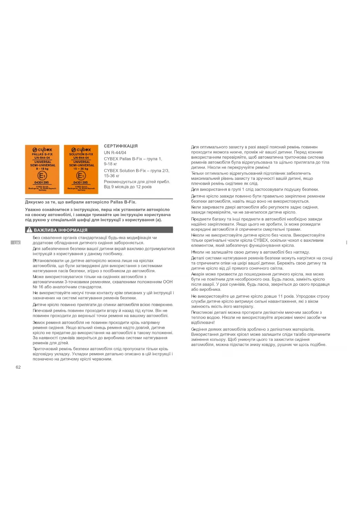 СЕРТИФІКАЦІЯ UN R-44/04 CYBEX Pallas B-Fix – група 1, 9-18 кг CYBEX Solution B-Fix – група 2/3, 15-36 кг Рекомендується для дітей прибл. Від 9 місяців до 12 років Дякуємо за те, що вибрали автокрісло Pallas B-Fix. Уважно ознайомтеся з інструкцією, перш ніж установити автокрісло на своєму автомобілі, і завжди тримайте цю інструкцію користувача під рукою у спеціальній шафці для інструкції з користування (a). ВАЖЛИВА ІНФОРМАЦІЯ