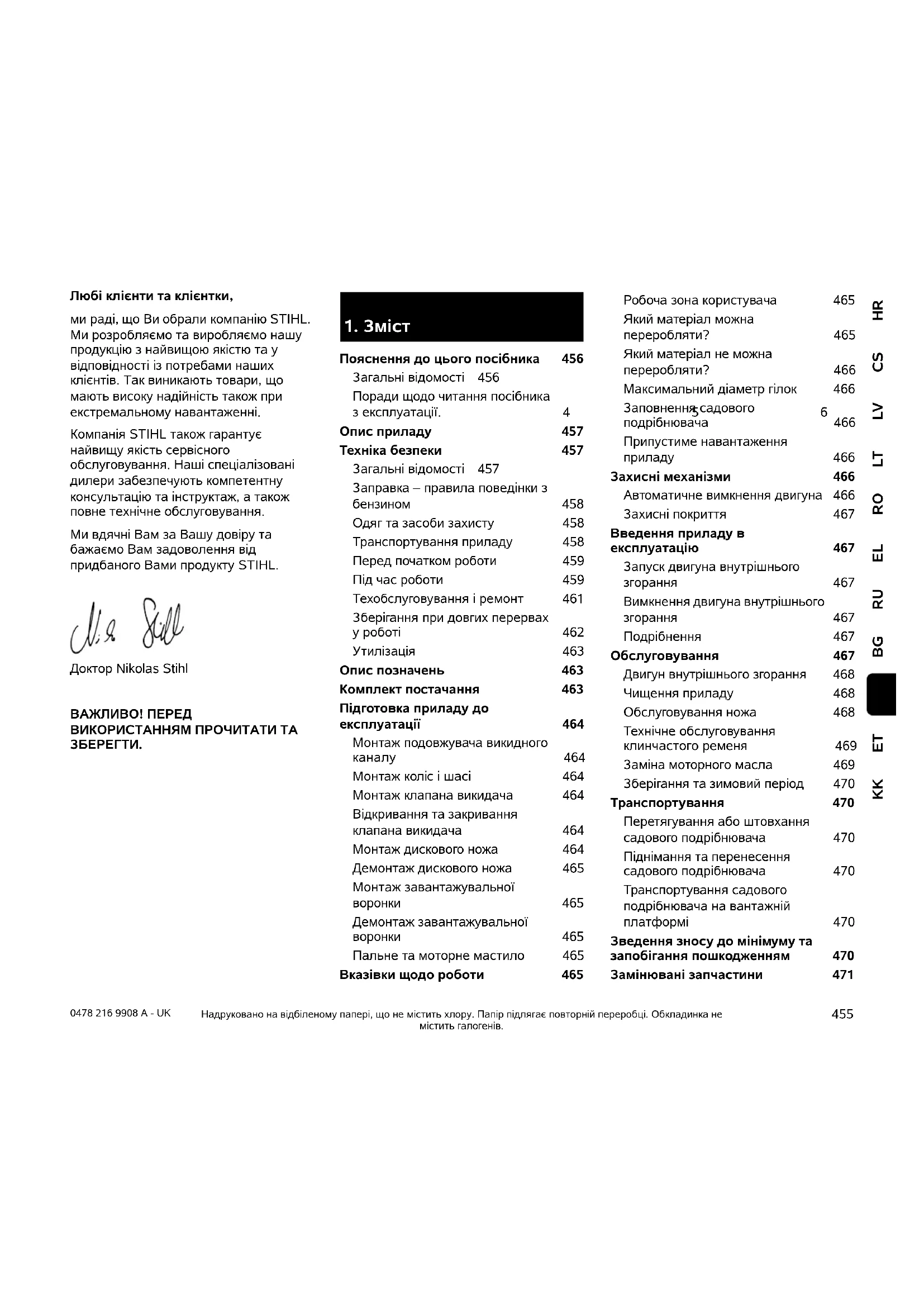 Пояснення до цього посібника 456 Загальні відомості 456 Поради щодо читання посібника з експлуатації.456 Опис приладу 457 Техніка безпеки 457 Загальні відомості 457 Заправка – правила поведінки з бензином 458 Одяг та засоби захисту 458 Транспортування приладу 458 Перед початком роботи 459 Під час роботи 459 Техобслуговування і ремонт 461 Зберігання при довгих перервах у роботі 462 Утилізація 463 Опис позначень 463 Комплект постачання 463 Підготовка приладу до експлуатації 464 Монтаж подовжувача викидного каналу 464 Монтаж коліс і шасі 464 Монтаж клапана викидача 464 Відкривання та закривання клапана викидача 464 Монтаж дискового ножа 464 Демонтаж дискового ножа 465 Монтаж завантажувальної воронки 465 Демонтаж завантажувальної воронки 465 Пальне та моторне мастило 465 Вказівки щодо роботи 465 Робоча зона користувача 465 Який матеріал можна переробляти?465 Який матеріал не можна переробляти?466 Максимальний діаметр гілок 466 Заповнення садового подрібнювача 466 Припустиме навантаження приладу 466 Захисні механізми 466 Автоматичне вимкнення двигуна 466 Захисні покриття 467 Введення приладу в експлуатацію 467 Запуск двигуна внутрішнього згорання 467 Вимкнення двигуна внутрішнього згорання 467 Подрібнення 467 Обслуговування 467 Двигун внутрішнього згорання 468 Чищення приладу 468 Обслуговування ножа 468 Технічне обслуговування клинчастого ременя 469 Заміна моторного масла 469 Зберігання та зимовий період 470 Транспортування 470 Перетягування або штовхання садового подрібнювача 470 Піднімання та перенесення садового подрібнювача 470 Транспортування садового подрібнювача на вантажній платформі 470 Зведення зносу до мінімуму та запобігання пошкодженням 470 Замінювані запчастини 4710478 216 9908 A - UK