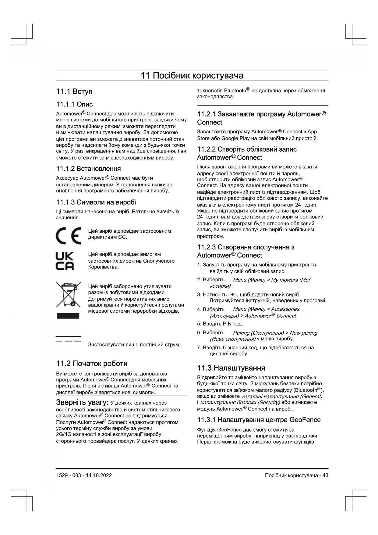 Ви можете контролювати виріб за допомогоюпрограми Automower Connect для мобільнихпристроїв. Після активації Automower Connect надисплеї виробу з’являться нові символи. Зверніть увагу: У деяких країнах черезособливості законодавства й систем стільниковогозв’язку Automower Connect не підтримується.Послуги Automower Connect надаються протягомусього терміну служби виробу за умови2G/4G наявності в зоні експлуатації виробустороннього провайдера послуг. У деяких країнахтехнологія Bluetooth не доступна через обмеженнязаконодавства.