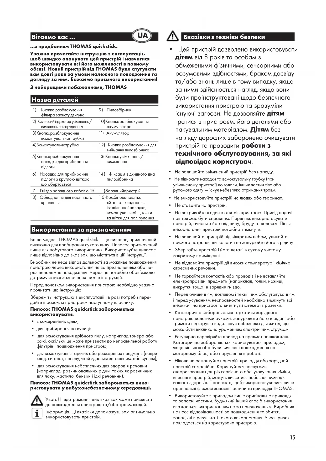 Правила и условия реализации не установлены изготовителем и должны соответствовать национальному и/или местному законодательству страны реализации товара.15 Вітаємо вас … …з придбанням THOMAS quickstick. Уважно прочитайте інструкцію з експлуатації, щоб швидко опанувати цей пристрій і навчитися використовувати всі його можливості в повному обсязі. Новий пристрій від THOMAS буде слугувати вам довгі роки за умови належного поводження та догляду за ним. Бажаємо приємного використання! З найкращими побажаннями, THOMAS Назва деталей