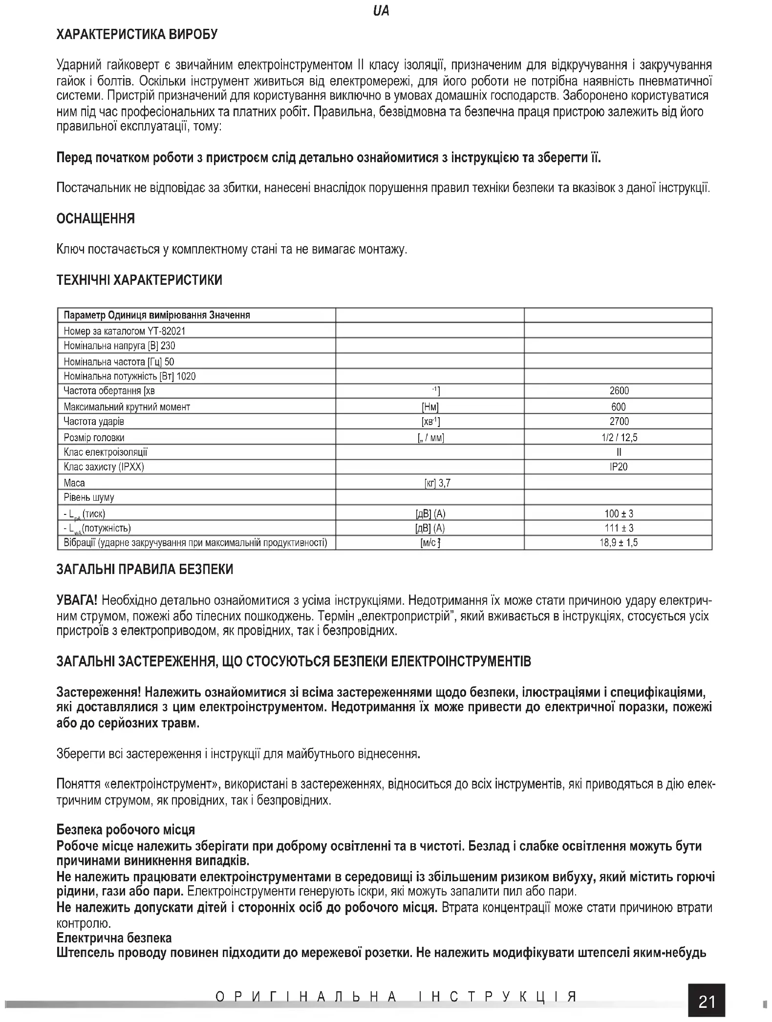 ХАРАКТЕРИСТИКА ВИРОБУ Ударний гайковерт є звичайним електроінструментом II класу ізоляції, призначеним для відкручування і закручування гайок і болтів. Оскільки інструмент живиться від електромережі, для його роботи не потрібна наявність пневматичної системи. Пристрій призначений для користування виключно в умовах домашніх господарств. Заборонено користуватися ним під час професіональних та платних робіт. Правильна, безвідмовна та безпечна праця пристрою залежить від його правильної експлуатації, тому: Перед початком роботи з пристроєм слід детально ознайомитися з інструкцією та зберегти її. Постачальник не відповідає за збитки, нанесені внаслідок порушення правил техніки безпеки та вказівок з даної інструкції.