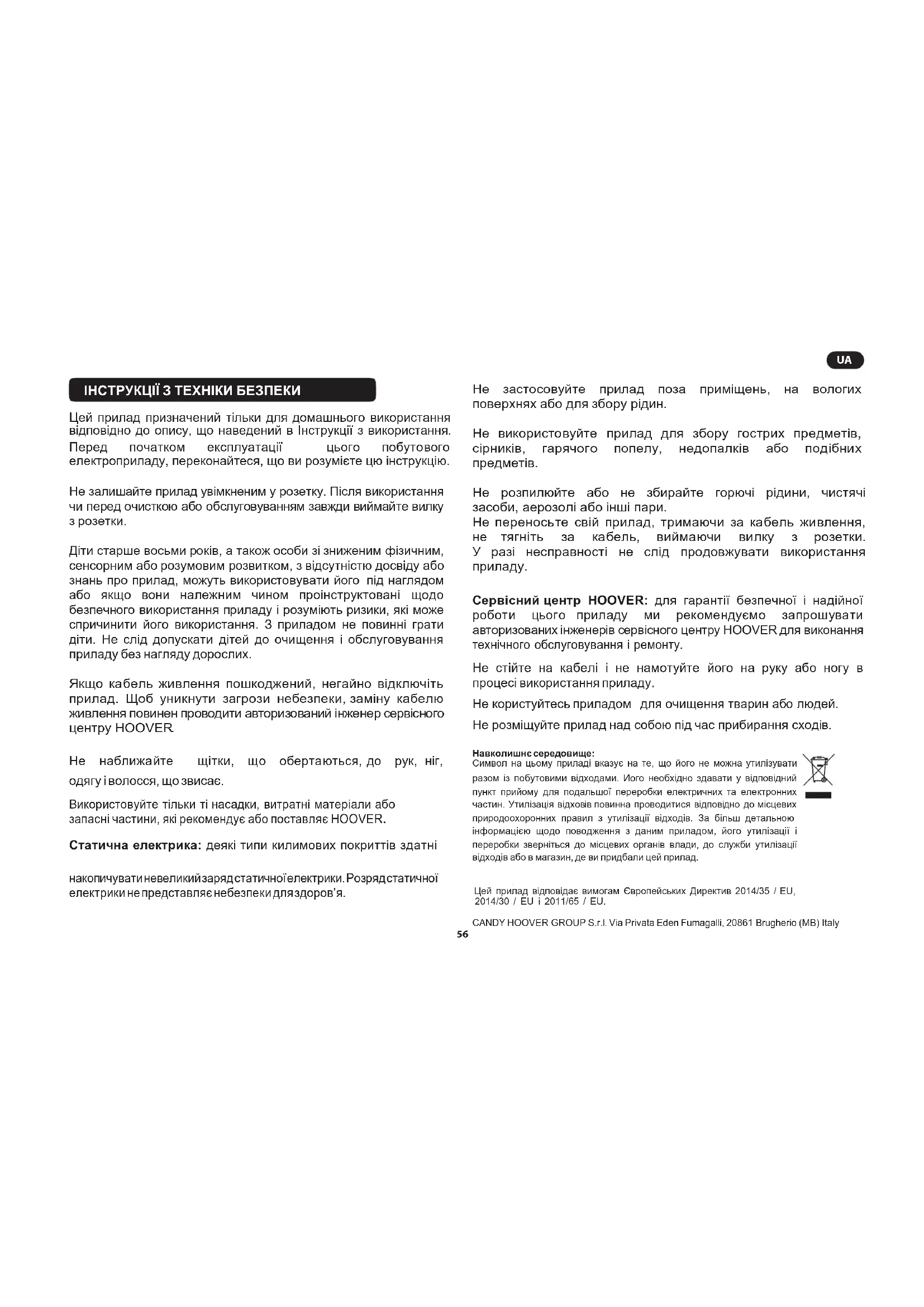 накопичувати невеликий заряд статичної електрики. Розряд статичної електрики не представляє небезпеки для здоров’я. Цей прилад відповідає вимогам Європейських Директив 2014/35 / EU, 2014/30 / EU і 2011/65 / EU. CANDY HOOVER GROUP S.r.l. Via Privata Eden Fumagalli, 20861 Brugherio (MB) Italy