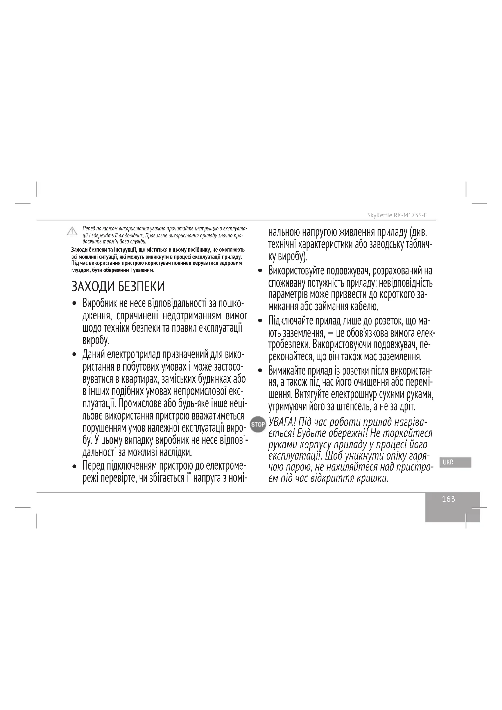 Google Play је регистровани заштитни знак компаније Google Inc.163 SkyKettle RK-M173S-E GBR FRA DEU NLD ITA ESP PRT DNK NOR SWE FIN LTU LVA EST ROU HUN BGR HRV SVK CZE POL RUS GRE TUR UKR KAZ Перед початком використання уважно прочитайте інструкцію з експлуата-ції і збережіть її як довідник. Правильне використання приладу значно про-довжить термін його служби.Заходи безпеки та інструкції, що містяться в цьому посібнику, не охоплюють всі можливі ситуації, які можуть виникнути в процесі експлуатації приладу. Під час використання пристрою користувач повинен керуватися здоровим глуздом, бути обережним і уважним. ЗАХОДИ БЕЗПЕКИ