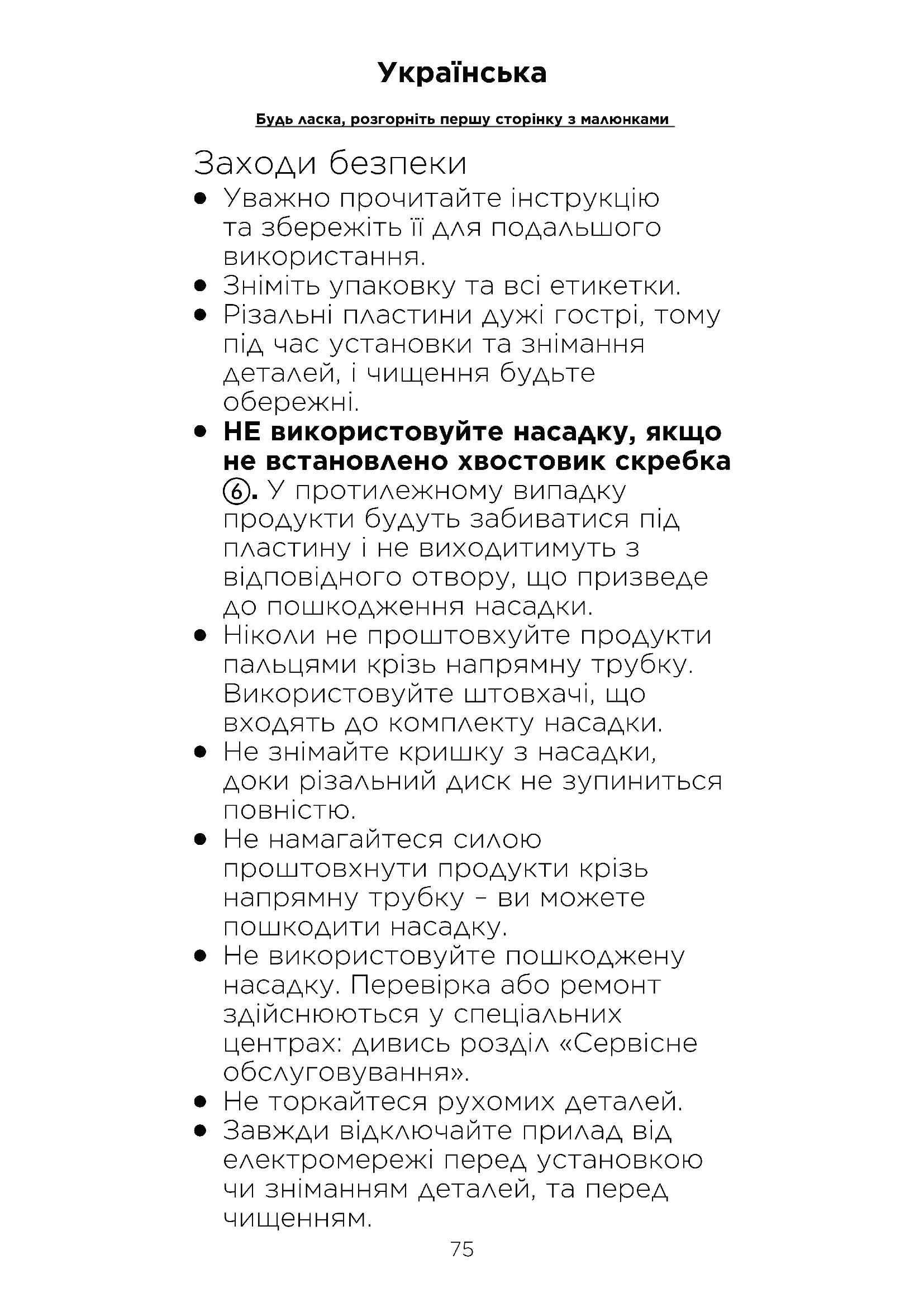 Ніколи не проштовхуйте продукти пальцями крізь напрямну трубку. Використовуйте штовхачі, що входять до комплекту насадки.