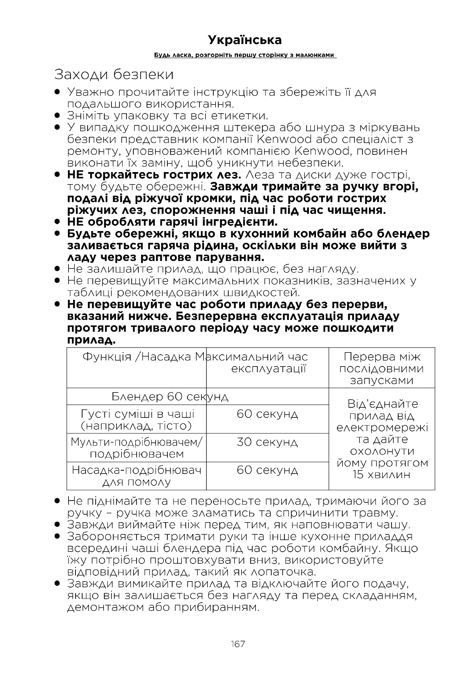 НЕ торкайтесь гострих лез. Леза та диски дуже гострі, тому будьте обережні. Завжди тримайте за ручку вгорі, подалі від ріжучої кромки, під час роботи гострих ріжучих лез, спорожнення чаші і під час чищення.