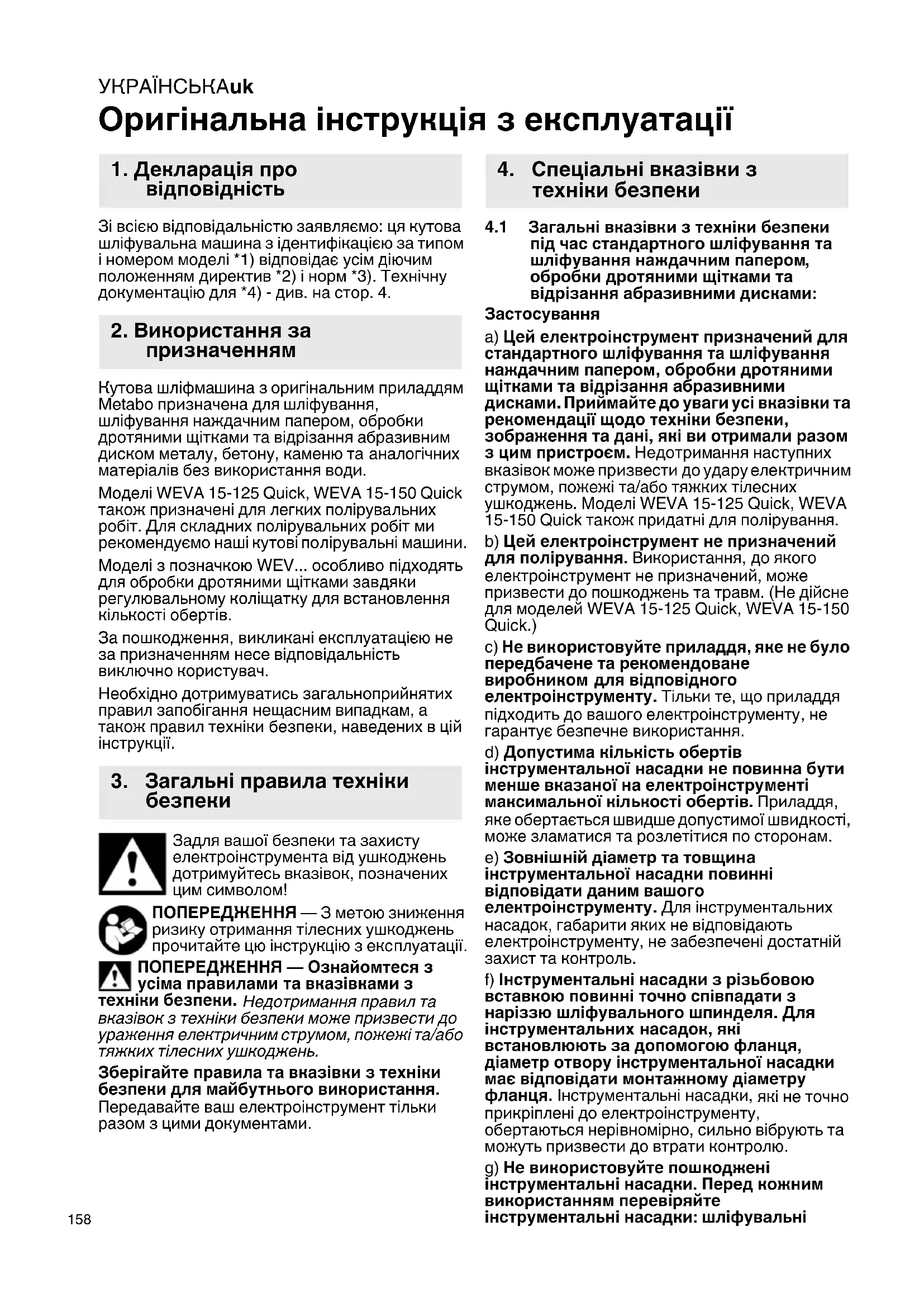 Оригінальна інструкція з експлуатації Зі всією відповідальністю заявляємо: ця кутова шліфувальна машина з ідентифікацією за типом і номером моделі *1) відповідає усім діючим положенням директив *2) і норм *3). Технічну документацію для *4) - див. на стор. 4. Кутова шліфмашина з оригінальним приладдям Metabo призначена для шліфування, шліфування наждачним папером, обробки дротяними щітками та відрізання абразивним диском металу, бетону, каменю та аналогічних матеріалів без використання води. Моделі WEVA 15-125 Quick, WEVA 15-150 Quick також призначені для легких полірувальних робіт. Для складних полірувальних робіт ми рекомендуємо наші кутові полірувальні машини. Моделі з позначкою WEV... особливо підходять для обробки дротяними щітками завдяки регулювальному коліщатку для встановлення кількості обертів. За пошкодження, викликані експлуатацією не за призначенням несе відповідальність виключно користувач. Необхідно дотримуватись загальноприйнятих правил запобігання нещасним випадкам, а також правил техніки безпеки, наведених в цій інструкції. Задля вашої безпеки та захисту електроінструмента від ушкоджень дотримуйтесь вказівок, позначених цим символом! ПОПЕРЕДЖЕННЯ — З метою зниження ризику отримання тілесних ушкоджень прочитайте цю інструкцію з експлуатації. ПОПЕРЕДЖЕННЯ — Ознайомтеся з усіма правилами та вказівками з техніки безпеки. Недотримання правил та вказівок з техніки безпеки може призвести до ураження електричним струмом, пожежі та/або тяжких тілесних ушкоджень. Зберігайте правила та вказівки з техніки безпеки для майбутнього використання. Передавайте ваш електроінструмент тільки разом з цими документами.