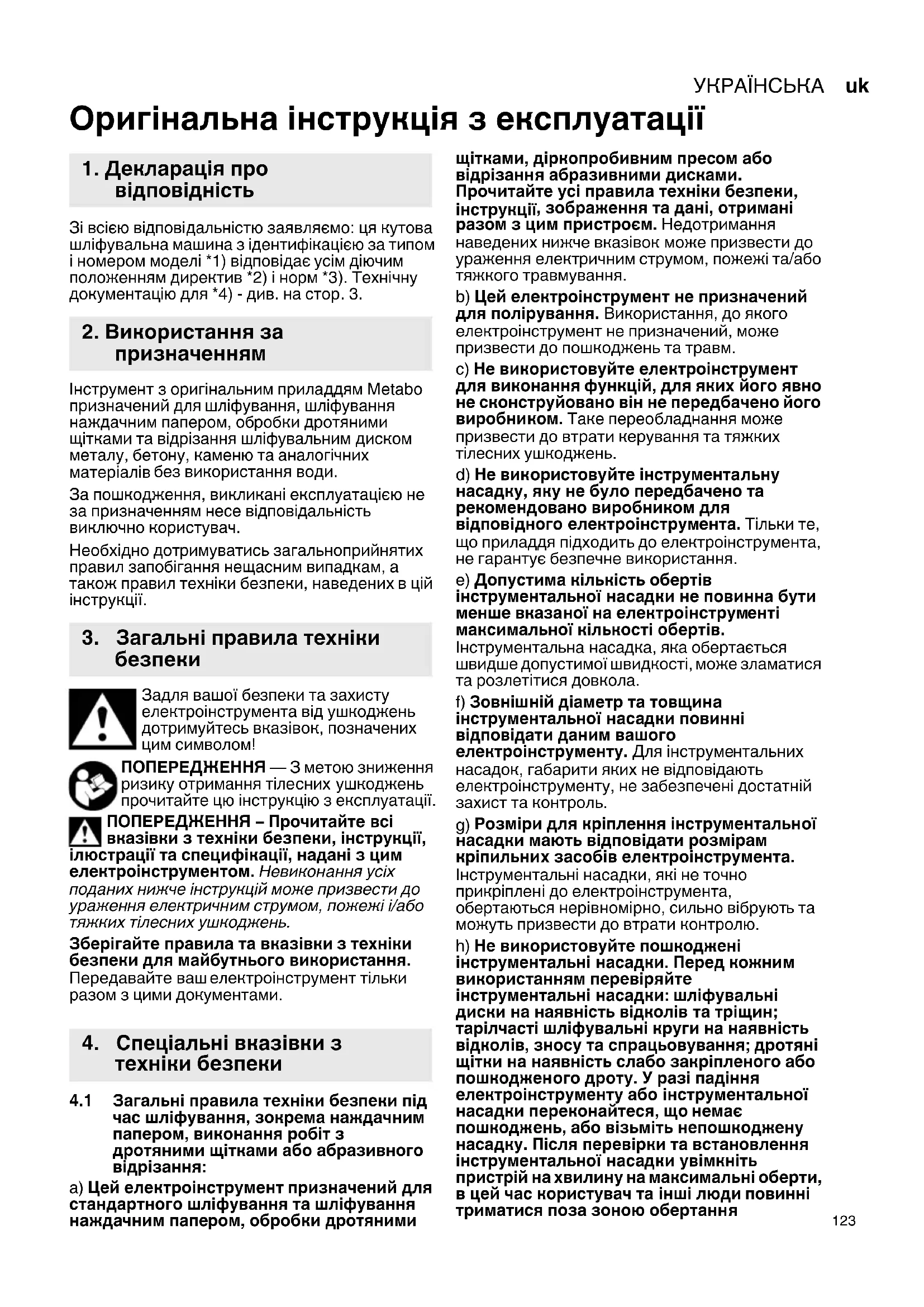 Оригінальна інструкція з експлуатації Зі всією відповідальністю заявляємо: ця кутова шліфувальна машина з ідентифікацією за типом і номером моделі *1) відповідає усім діючим положенням директив *2) і норм *3). Технічну документацію для *4) - див. на стор. 3. Інструмент з оригінальним приладдям Metabo призначений для шліфування, шліфування наждачним папером, обробки дротяними щітками та відрізання шліфувальним диском металу, бетону, каменю та аналогічних
