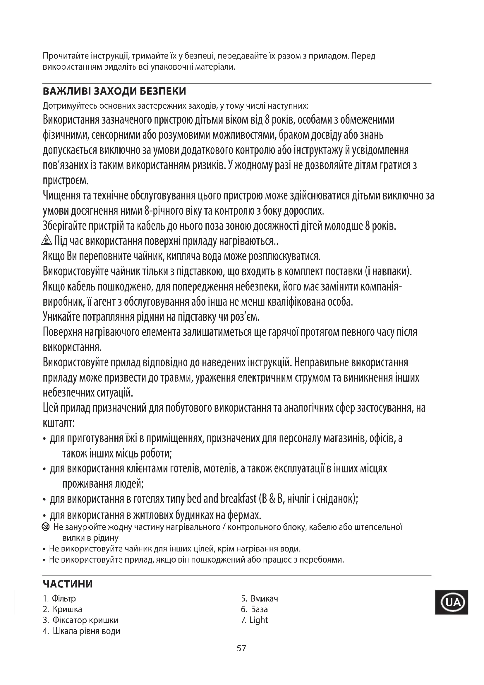 Чищення та технічне обслуговування цього пристрою може здійснюватися дітьми виключно за умови досягнення ними 8-річного віку та контролю з боку дорослих. Зберігайте пристрій та кабель до нього поза зоною досяжності дітей молодше 8 років. h Під час використання поверхні приладу нагріваються.. Якщо Ви переповните чайник, кипляча вода може розплюскуватися. Використовуйте чайник тільки з підставкою, що входить в комплект поставки (і навпаки). Якщо кабель пошкоджено, для попередження небезпеки, його має замінити компанія- виробник, її агент з обслуговування або інша не менш кваліфікована особа. Уникайте потрапляння рідини на підставку чи роз’єм. Поверхня нагріваючого елемента залишатиметься ще гарячої протягом певного часу після використання. Використовуйте прилад відповідно до наведених інструкцій. Неправильне використання приладу може призвести до травми, ураження електричним струмом та виникнення інших небезпечних ситуацій. Цей прилад призначений для побутового використання та аналогічних сфер застосування, на