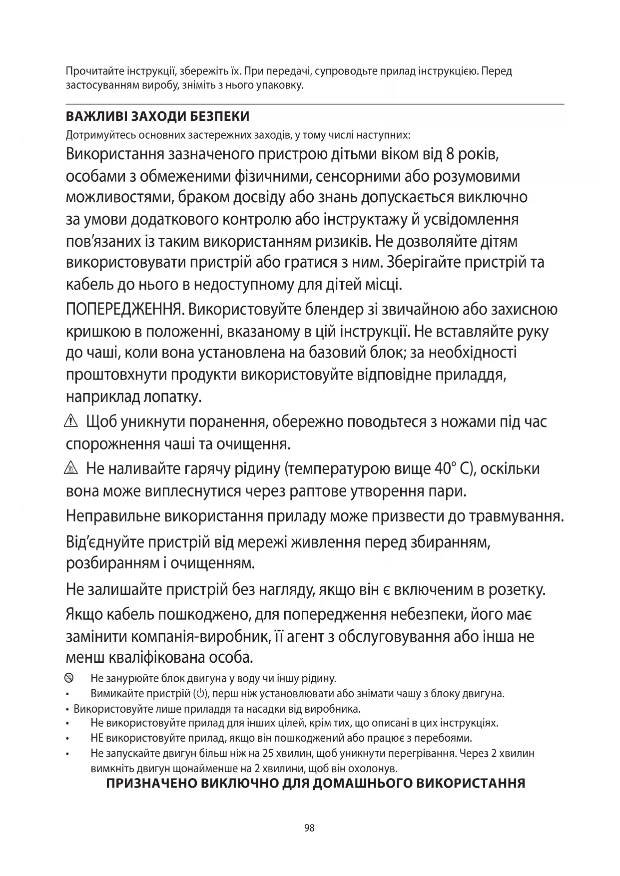 AE98 Прочитайте інструкції, збережіть їх. При передачі, супроводьте прилад інструкцією. Перед застосуванням виробу, зніміть з нього упаковку. ВАЖЛИВІ ЗАХОДИ БЕЗПЕКИ Дотримуйтесь основних застережних заходів, у тому числі наступних: Використання зазначеного пристрою дітьми віком від 8 років, особами з обмеженими фізичними, сенсорними або розумовими можливостями, браком досвіду або знань допускається виключно за умови додаткового контролю або інструктажу й усвідомлення пов’язаних із таким використанням ризиків. Не дозволяйте дітям використовувати пристрій або гратися з ним. Зберігайте пристрій та кабель до нього в недоступному для дітей місці. ПОПЕРЕДЖЕННЯ. Використовуйте блендер зі звичайною або захисною кришкою в положенні, вказаному в цій інструкції. Не вставляйте руку до чаші, коли вона установлена на базовий блок; за необхідності проштовхнути продукти використовуйте відповідне приладдя, наприклад лопатку. c Щоб уникнути поранення, обережно поводьтеся з ножами під час спорожнення чаші та очищення. h Не наливайте гарячу рідину (температурою вище 40° C), оскільки вона може виплеснутися через раптове утворення пари. Неправильне використання приладу може призвести до травмування. Від’єднуйте пристрій від мережі живлення перед збиранням, розбиранням і очищенням. Не залишайте пристрій без нагляду, якщо він є включеним в розетку. Якщо кабель пошкоджено, для попередження небезпеки, його має замінити компанія-виробник, її агент з обслуговування або інша не менш кваліфікована особа. l Не занурюйте блок двигуна у воду чи іншу рідину.