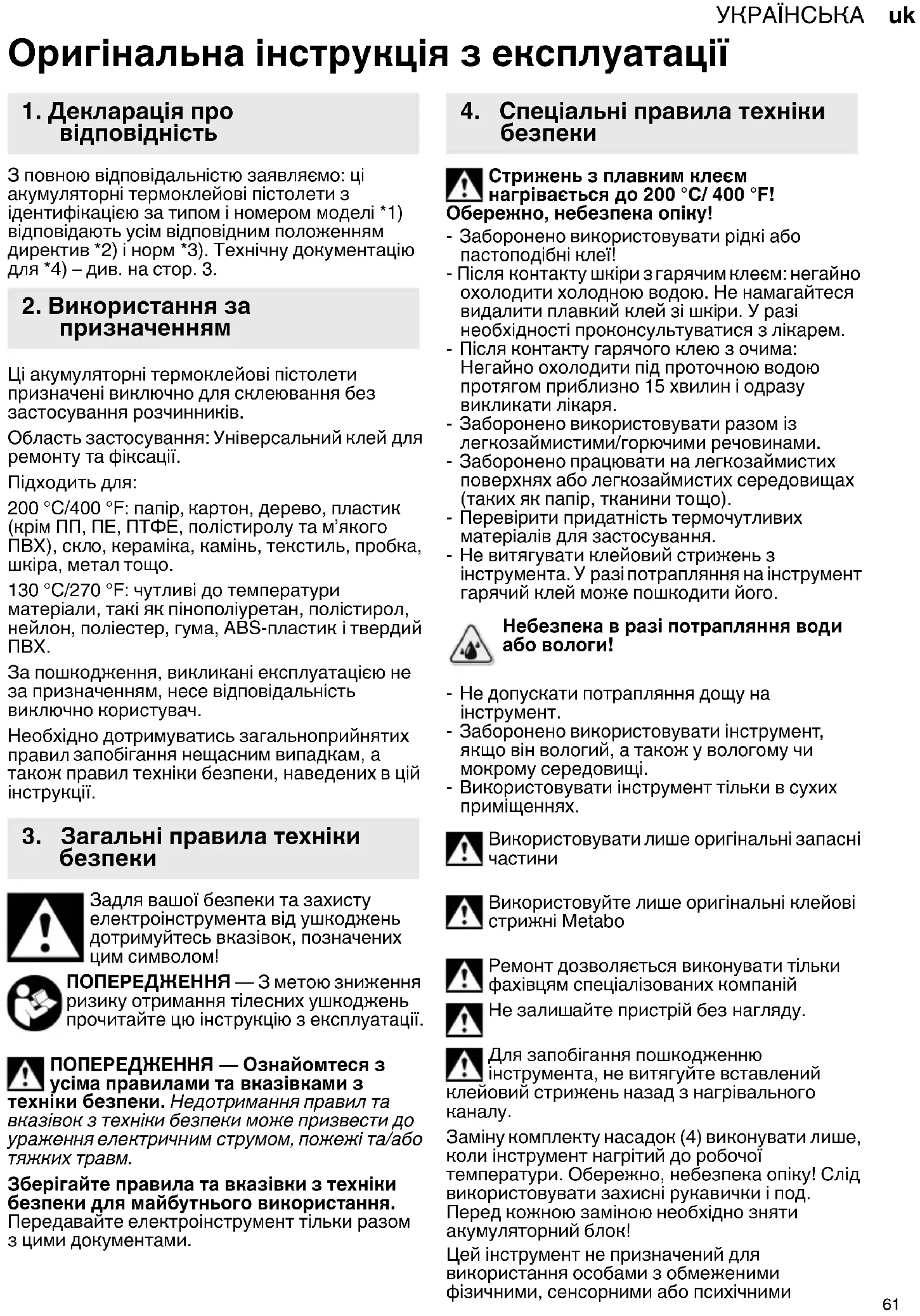 Оригінальна інструкція з експлуатації З повною відповідальністю заявляємо: ці акумуляторні термоклейові пістолети з ідентифікацією за типом і номером моделі *1) відповідають усім відповідним положенням директив *2) і норм *3). Технічну документацію для *4) – див. на стор. 3. Ці акумуляторні термоклейові пістолети призначені виключно для склеювання без застосування розчинників. Область застосування: Універсальний клей для ремонту та фіксації. Підходить для: 200 °C/400 °F: папір, картон, дерево, пластик (крім ПП, ПЕ, ПТФЕ, полістиролу та м’якого ПВХ), скло, кераміка, камінь, текстиль, пробка, шкіра, метал тощо. 130 °C/270 °F: чутливі до температури матеріали, такі як пінополіуретан, полістирол, нейлон, поліестер, гума, ABS-пластик і твердий