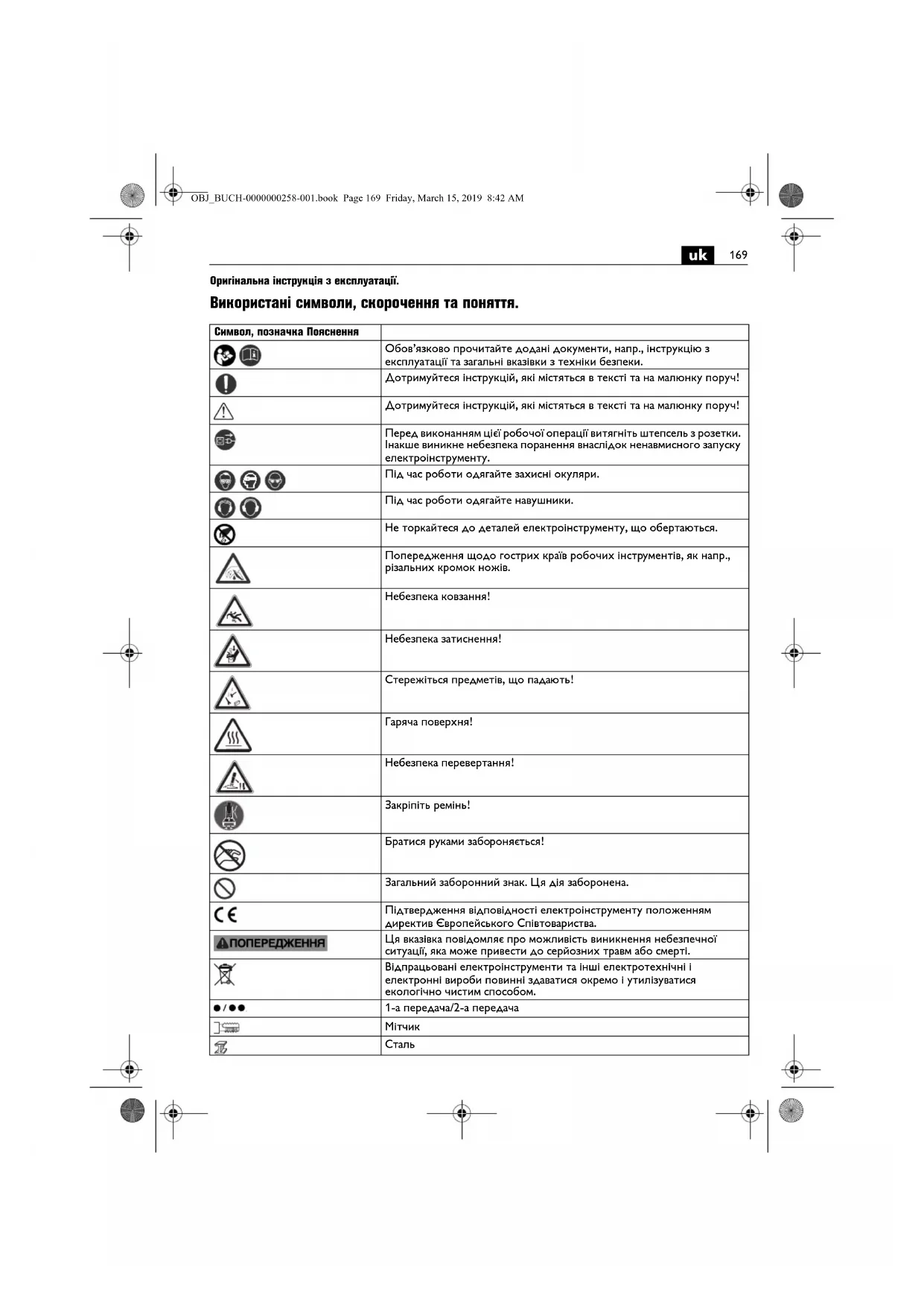 Оригінальна інструкція з експлуатації. Використані символи, скорочення та поняття. Символ, позначка Пояснення Обов’язково прочитайте додані документи, напр., інструкцію з експлуатації та загальні вказівки з техніки безпеки. Дотримуйтеся інструкцій, які містяться в тексті та на малюнку поруч! Дотримуйтеся інструкцій, які містяться в тексті та на малюнку поруч! Перед виконанням цієї робочої операції витягніть штепсель з розетки. Інакше виникне небезпека поранення внаслідок ненавмисного запуску електроінструменту. Під час роботи одягайте захисні окуляри. Під час роботи одягайте навушники. Не торкайтеся до деталей електроінструменту, що обертаються. Попередження щодо гострих країв робочих інструментів, як напр., різальних кромок ножів. Небезпека ковзання! Небезпека затиснення! Стережіться предметів, що падають! Гаряча поверхня! Небезпека перевертання! Закріпіть ремінь! Братися руками забороняється! Загальний заборонний знак. Ця дія заборонена. Підтвердження відповідності електроінструменту положенням директив Європейського Співтовариства. Ця вказівка повідомляє про можливість виникнення небезпечної ситуації, яка може привести до серйозних травм або смерті. Відпрацьовані електроінструменти та інші електротехнічні і електронні вироби повинні здаватися окремо і утилізуватися екологічно чистим способом. 1-а передача/2-а передача