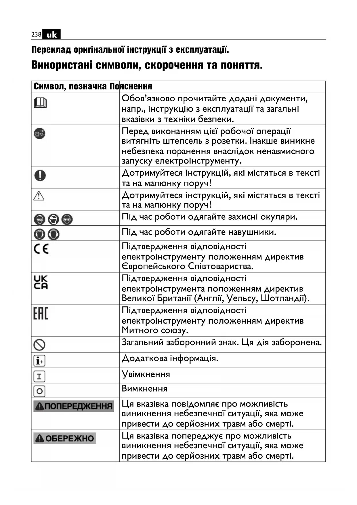 Переклад оригінальної інструкції з експлуатації. Використані символи, скорочення та поняття. Символ, позначка Пояснення Обов’язково прочитайте додані документи, напр., інструкцію з експлуатації та загальні вказівки з техніки безпеки. Перед виконанням цієї робочої операції витягніть штепсель з розетки. Інакше виникне небезпека поранення внаслідок ненавмисного запуску електроінструменту. Дотримуйтеся інструкцій, які містяться в тексті та на малюнку поруч! Дотримуйтеся інструкцій, які містяться в тексті та на малюнку поруч! Під час роботи одягайте захисні окуляри. Під час роботи одягайте навушники. Підтвердження відповідності електроінструменту положенням директив Європейського Співтовариства. Підтвердження відповідності електроінструмента положенням директив Великої Британії (Англії, Уельсу, Шотландії). Підтвердження відповідності електроінструменту положенням директив Митного союзу. Загальний заборонний знак. Ця дія заборонена. Додаткова інформація.