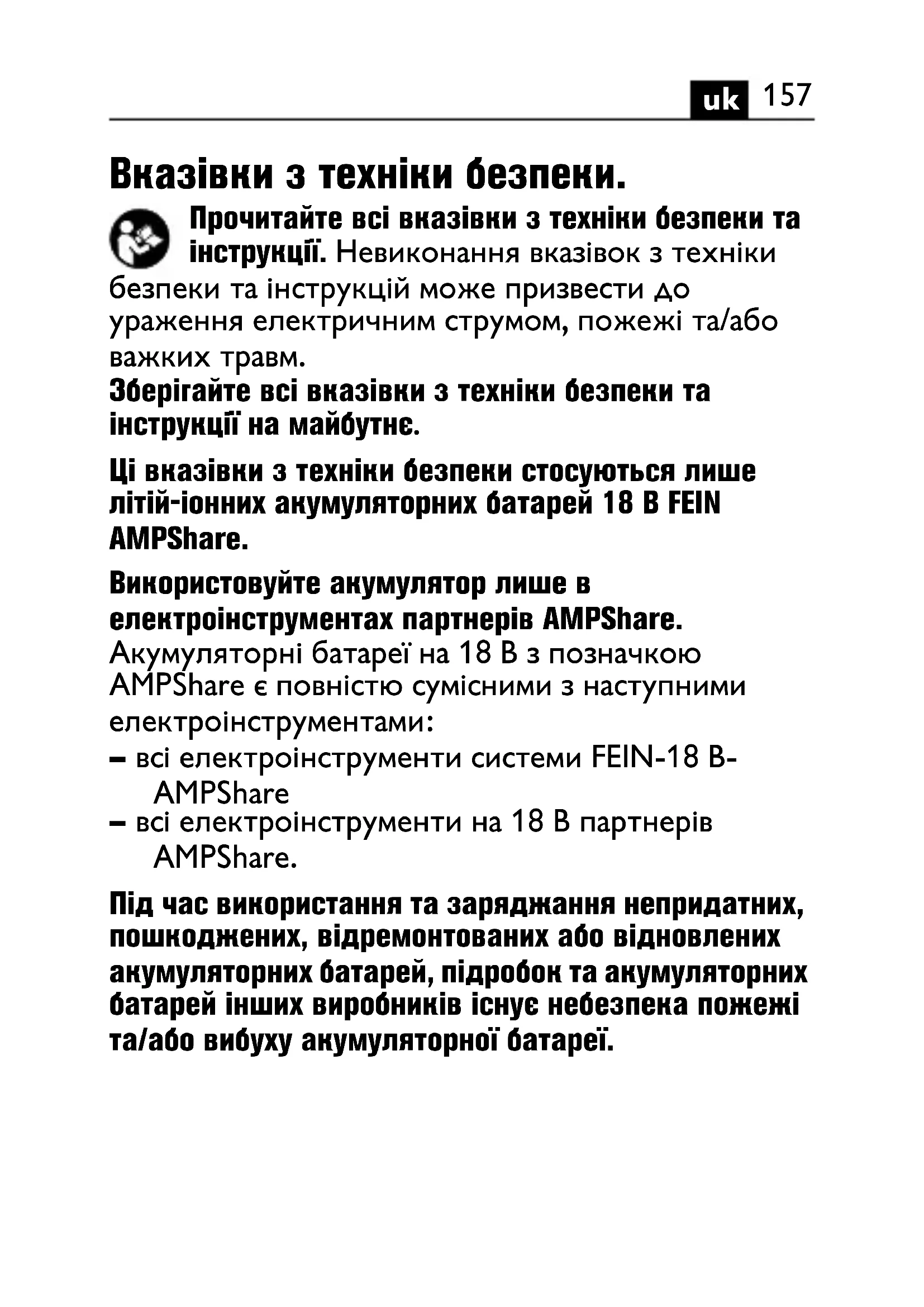 Дотримуйтеся рекомендацій стосовно акумуляторної батареї, що містяться в інструкції з експлуатації електроінструмента. Лише таким чином можна забезпечити безпечну експлуатацію акумуляторної батареї та електроінструмента і захистити акумулятори від небезпечного перевантаження. Заряджайте акумуляторні батареї лише зарядними пристроями, рекомендованими компанією FEIN або одним з партнерів AMPShare. Якщо зарядний пристрій призначений для певного типу акумуляторних батарей, заряджання в ньому інших акумуляторів є небезпечним через можливість виникнення пожежі. Акумуляторна батарея постачається у частково зарядженому стані. Щоб забезпечити повну ємність акумуляторної батареї, перед першим використанням її треба повністю зарядити в зарядному пристрої. Зберігайте акумуляторні батареї у недосяжному для дітей місці. Не розбирайте, не відкривайте і не розколюйте акумуляторні батареї. Не піддавайте акумуляторні батареї механічним ударам. У разі пошкодження або неправильної експлуатації акумуляторних батарей може виділятися шкідлива пара або рідина. Пара може викликати подразнення дихальних шляхів. Акумуляторна рідина може спричинити подразнення шкіри або опіки.159