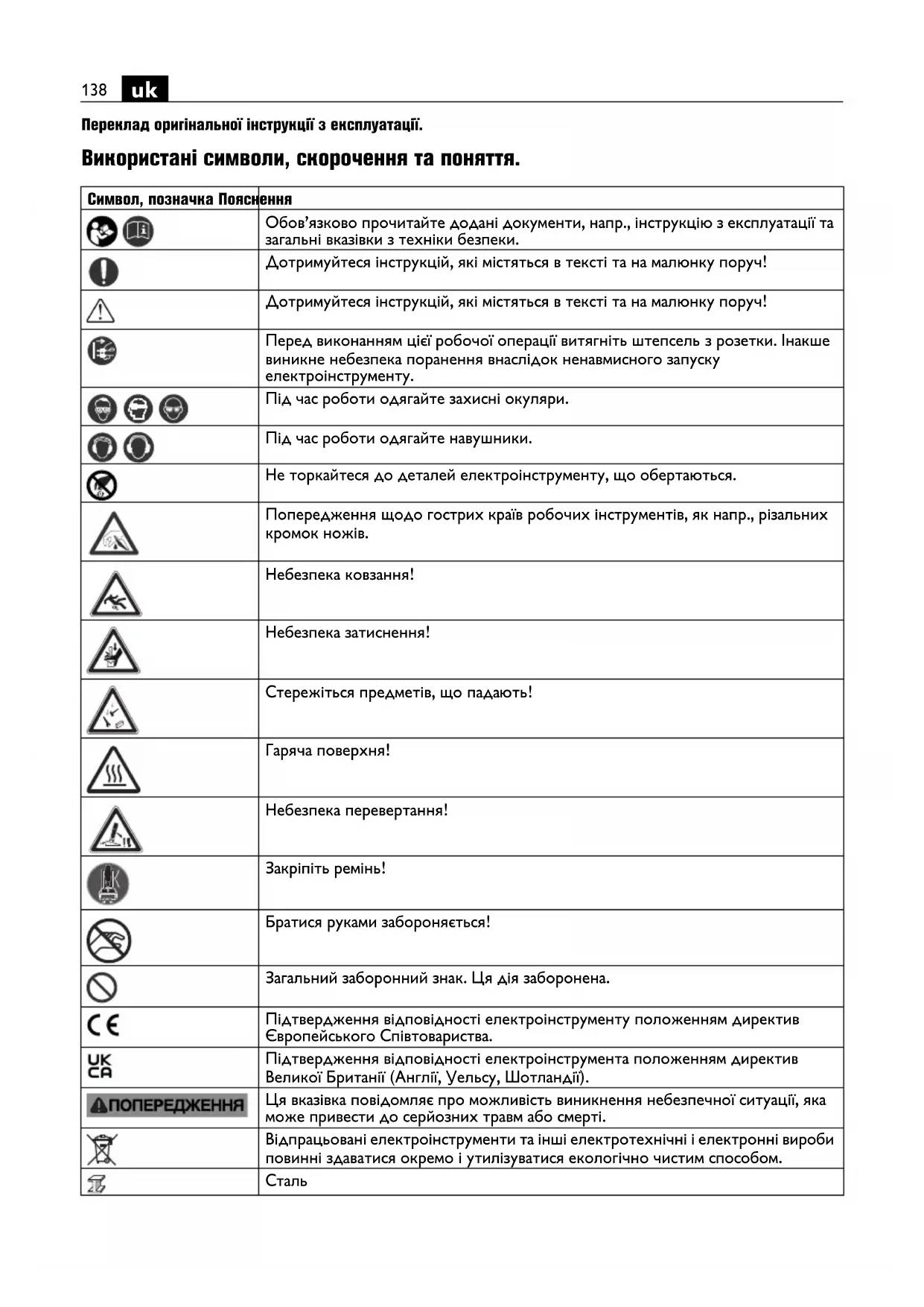 Братися руками забороняється! Загальний заборонний знак. Ця дія заборонена. Підтвердження відповідності електроінструменту положенням директив Європейського Співтовариства. Підтвердження відповідності електроінструмента положенням директив Великої Британії (Англії, Уельсу, Шотландії). Ця вказівка повідомляє про можливість виникнення небезпечної ситуації, яка може привести до серйозних травм або смерті. Відпрацьовані електроінструменти та інші електротехнічні і електронні вироби повинні здаватися окремо і утилізуватися екологічно чистим способом. Сталь139