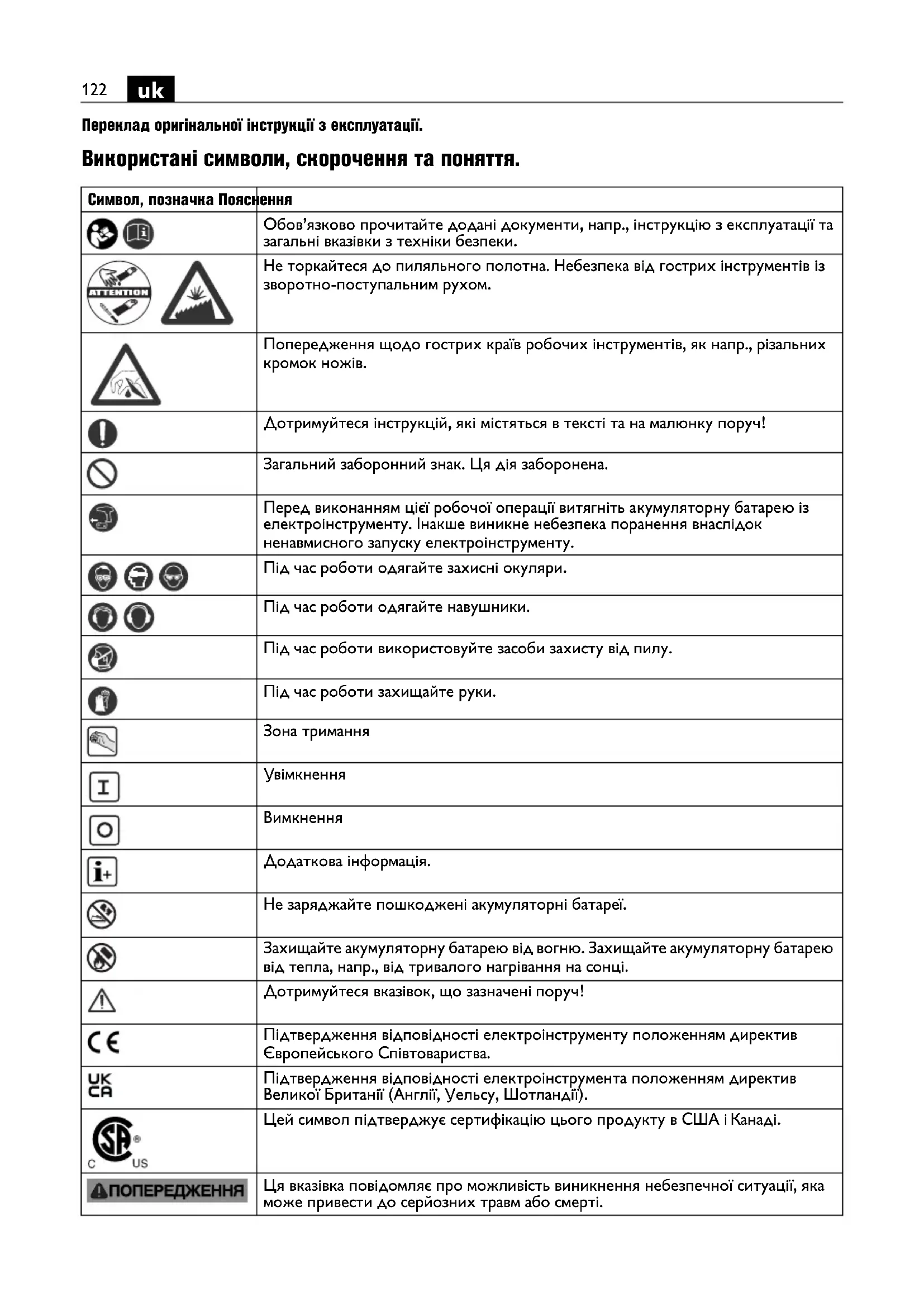 Переклад оригінальної інструкції з експлуатації. Використані символи, скорочення та поняття. Символ, позначка Пояснення Обов’язково прочитайте додані документи, напр., інструкцію з експлуатації та загальні вказівки з техніки безпеки. Не торкайтеся до пиляльного полотна. Небезпека від гострих інструментів із зворотно-поступальним рухом. Попередження щодо гострих країв робочих інструментів, як напр., різальних кромок ножів. Дотримуйтеся інструкцій, які містяться в тексті та на малюнку поруч! Загальний заборонний знак. Ця дія заборонена. Перед виконанням цієї робочої операції витягніть акумуляторну батарею із електроінструменту. Інакше виникне небезпека поранення внаслідок ненавмисного запуску електроінструменту. Під час роботи одягайте захисні окуляри. Під час роботи одягайте навушники. Під час роботи використовуйте засоби захисту від пилу. Під час роботи захищайте руки. Зона тримання