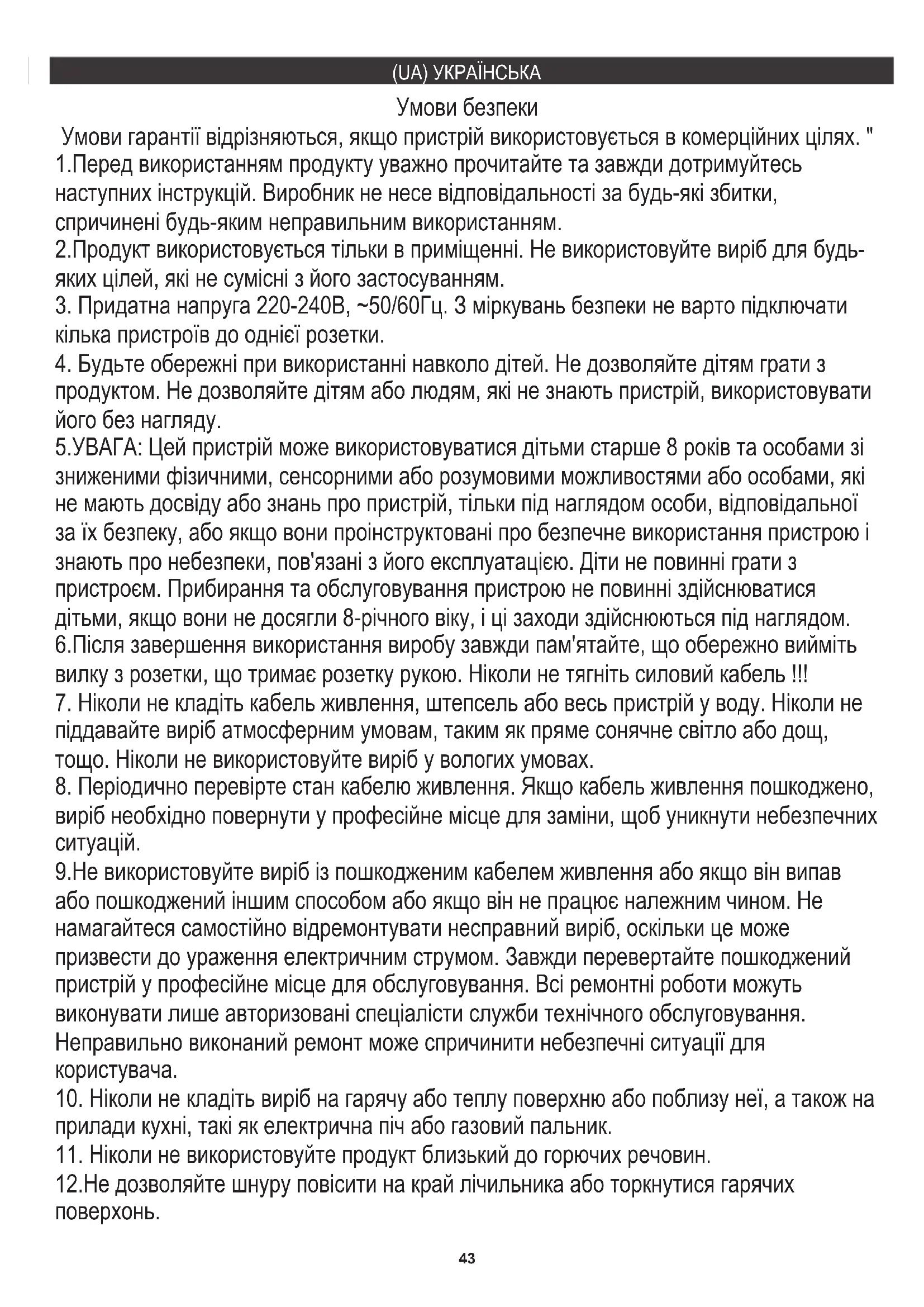 5.УВАГА: Цей пристрій може використовуватися дітьми старше 8 років та особами зі зниженими фізичними, сенсорними або розумовими можливостями або особами, які не мають досвіду або знань про пристрій, тільки під наглядом особи, відповідальної за їх безпеку, або якщо вони проінструктовані про безпечне використання пристрою і знають про небезпеки, пов'язані з його експлуатацією. Діти не повинні грати з пристроєм. Прибирання та обслуговування пристрою не повинні здійснюватися дітьми, якщо вони не досягли 8-річного віку, і ці заходи здійснюються під наглядом. 12.Не дозволяйте шнуру повісити на край лічильника або торкнутися гарячих