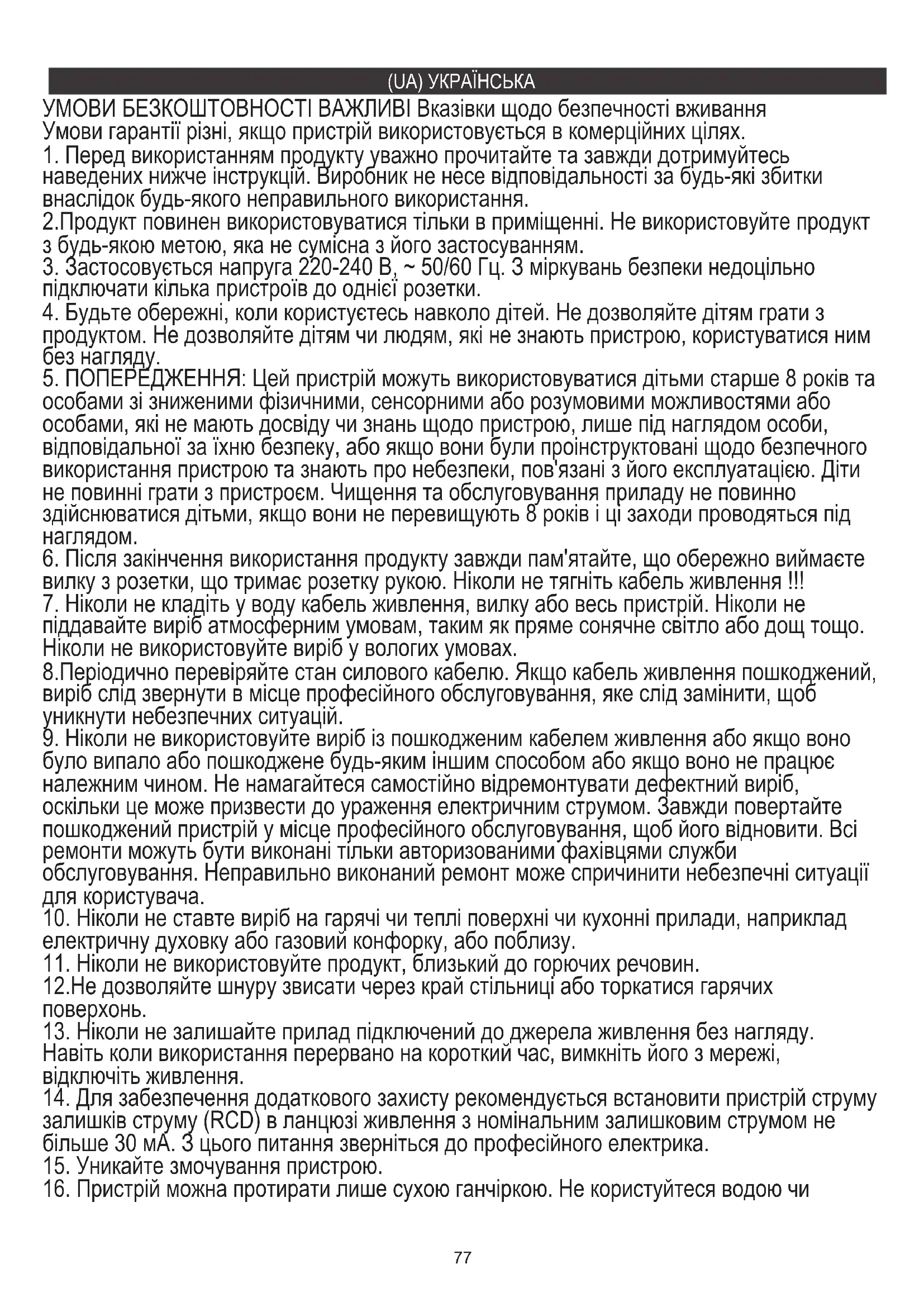 особами зі зниженими фізичними, сенсорними або розумовими можливостями або особами, які не мають досвіду чи знань щодо пристрою, лише під наглядом особи, відповідальної за їхню безпеку, або якщо вони були проінструктовані щодо безпечного використання пристрою та знають про небезпеки, пов'язані з його експлуатацією. Діти не повинні грати з пристроєм. Чищення та обслуговування приладу не повинно здійснюватися дітьми, якщо вони не перевищують 8 років і ці заходи проводяться під