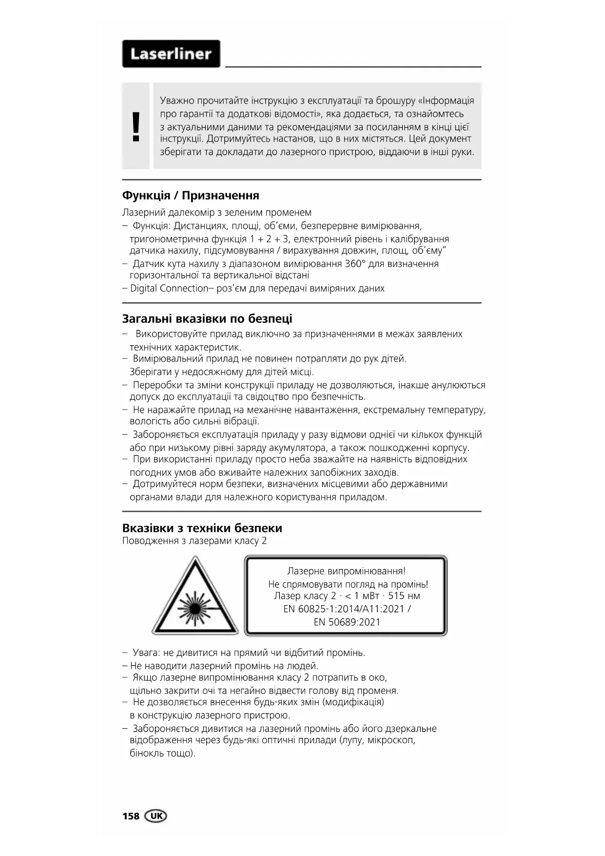 Предписания ЕС и Великобритании и утилизация Прибор соответствует всем необходимым требованиям, регламентирующие свободный товарооборот на территории ЕС и Великобритании. Данное изделие, включая комплектующие принадлежности и упаковку, является электрическим устройством, которое согласно директивам ЕС и Великобритании о старых электрических и электронных устройствах, элементах питания, аккумуляторах и упаковочных материалах должно быть передано на утилизацию экологически безопасным способом с целью получения ценного сырья. Электрические приборы, батарейки и упаковка не относятся к бытовым отходам. Потребители по закону обязаны бесплатно сдавать использованные батарейки и аккумуляторы в специализированные общественные пункты сбора отходов, либо по месту продажи или в службу технической поддержки. Извлеките батарейку с помощью обычных инструментов, не разрушая её, и сдайте в специальный пункт сбора, прежде чем отправите прибор на утилизацию. По всем вопросам об извлечении батареек обращайтесь в сервисный отдел UMAREX-LASERLINER. Информацию о пунктах сбора и утилизации отходов можно получить в администрации по месту жительства. Соблюдайте инструкции по утилизации и правила техники безопасности в пунктах приёма отходов. Другие правила техники безопасности и дополнительные http://laserliner.com/info?an=AHE158 Вказівки з техніки безпеки Поводження з лазерами класу 2 – Використовуйте прилад виключно за призначеннями в межах заявлених технічних характеристик. – Вимірювальний прилад не повинен потрапляти до рук дітей. Зберігати у недосяжному для дітей місці. – Переробки та зміни конструкції приладу не дозволяються, інакше анулюються допуск до експлуатації та свідоцтво про безпечність. – Не наражайте прилад на механічне навантаження, екстремальну температуру, вологість або сильні вібрації. – Забороняється експлуатація приладу у разу відмови однієї чи кількох функцій або при низькому рівні заряду акумулятора, а також пошкодженні корпусу. – При використанні приладу просто неба зважайте на наявність відповідних погодних умов або вживайте належних запобіжних заходів. – Дотримуйтеся норм безпеки, визначених місцевими або державними органами влади для належного користування приладом. Загальні вказівки по безпеці Лазерний далекомір з зеленим променем – Функція: Дистанциях, площі, об‘єми, безперервне вимірювання, тригонометрична функція 1 + 2 + 3, електронний рівень і калібрування датчика нахилу, підсумовування / вирахування довжин, площ, об‘єму“ – Датчик кута нахилу з діапазоном вимірювання 360° для визначення горизонтальної та вертикальної відстані – Digital Connection– роз‘єм для передачі виміряних даних Функція / Призначення Уважно прочитайте інструкцію з експлуатації та брошуру «Інформація про гарантії та додаткові відомості», яка додається, та ознайомтесь з актуальними даними та рекомендаціями за посиланням в кінці цієї інструкції. Дотримуйтесь настанов, що в них містяться. Цей документ зберігати та докладати до лазерного пристрою, віддаючи в інші руки.