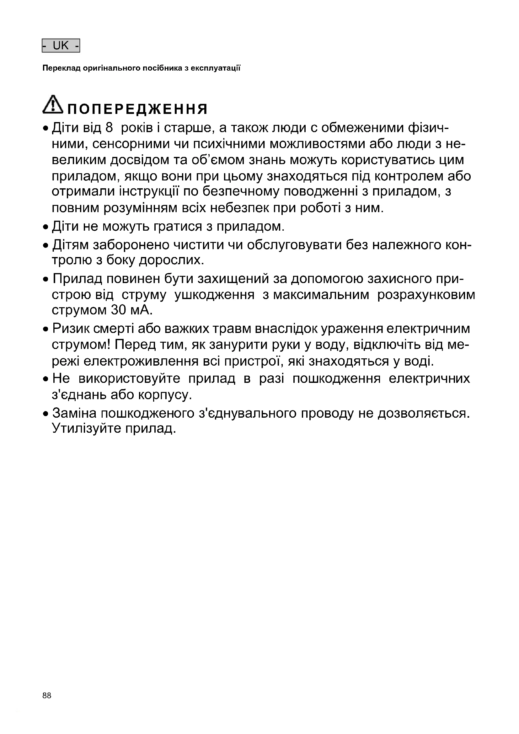 - Заміна пошкодженого з'єднувального проводу не дозволяється. Утилізуйте прилад.- UK -