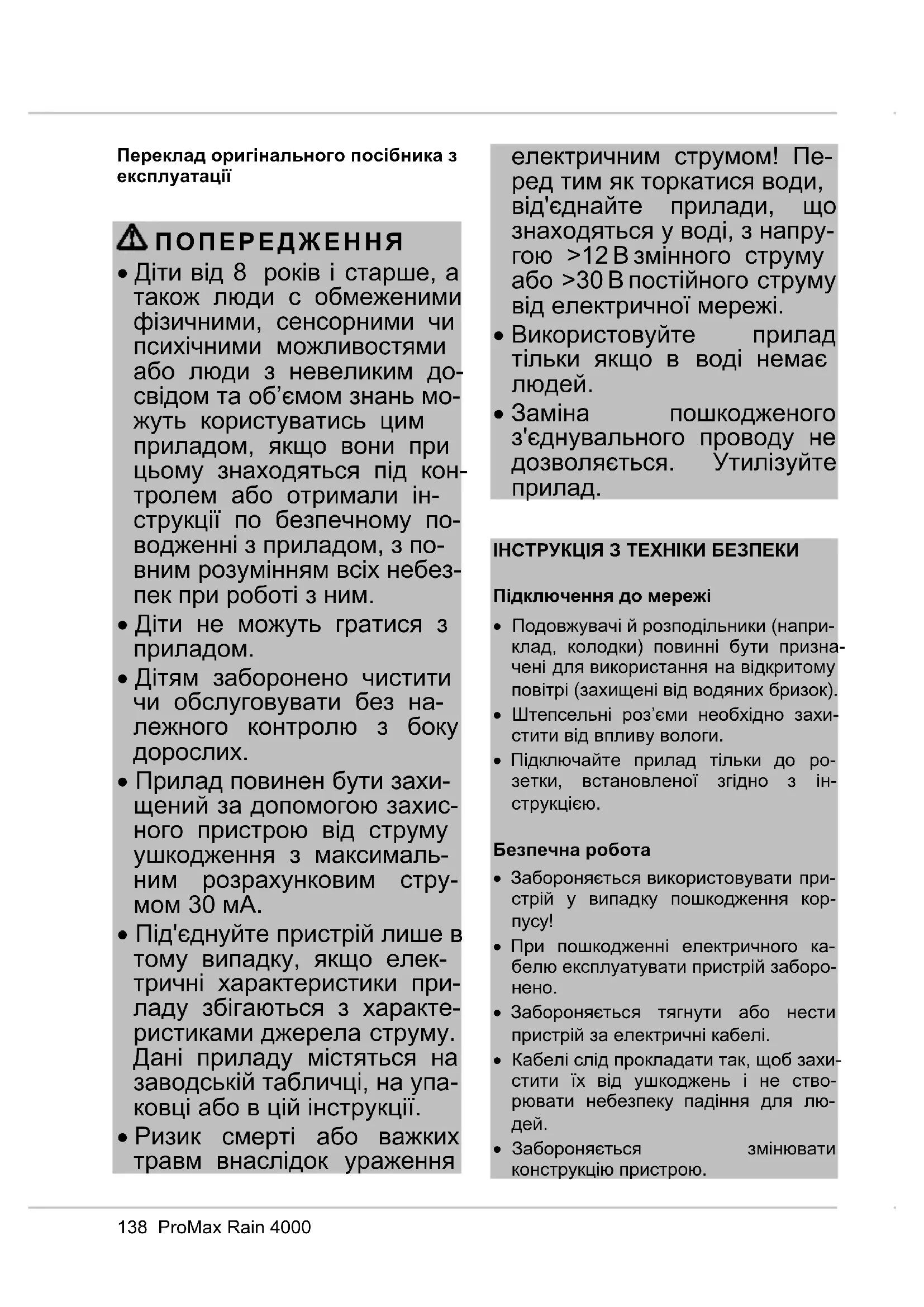 Тривала експлуатація приладу заборо- нена. У протилежному випадку строк служби приладу відповідно скоро- чується.142 ProMax Rain 4000